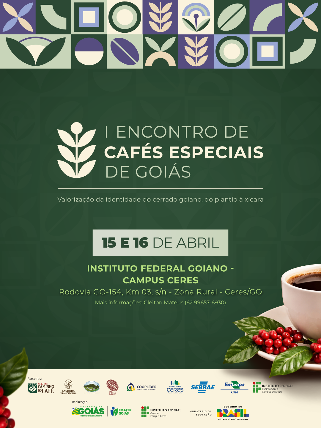O Instituto Federal Goiano (IF Goiano) e a Agência Goiana de Assistência Técnica, Extensão Rural e Pesquisa Agropecuária (Emater Goiás) realizam, nos dias 15 e 16 de abril, o Encontro de Cafés Especiais de Goiás, com o tema Valorização da identidade do Cerrado goiano, do plantio à xícara. O evento será realizado no Campus Ceres e busca reunir produtores, especialistas e entusiastas, integrando conhecimento técnico-científico e experiências práticas para orientar decisões em toda a cadeia produtiva. As inscrições são gratuitas e seguem até 10 de abril, na página do evento.