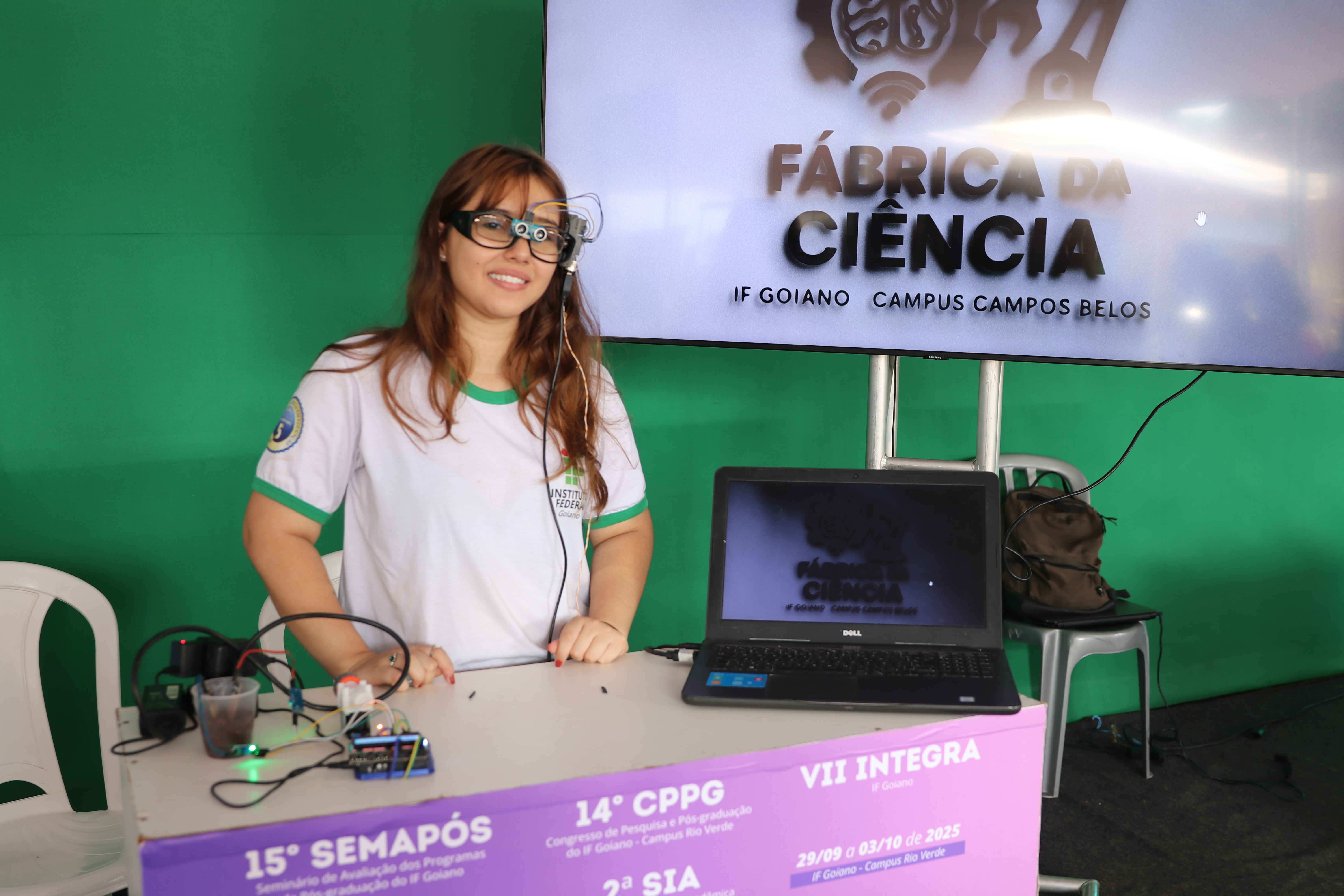 A estudante Karla Lima Bastos, que cursa ensino médio integrado ao curso técnico do Campus Campos Belos, trouxe ao evento um protótipo de óculos para cego. “Pode parecer estranho o nome, mas esses óculos possuem sensores que identificam a aproximação de qualquer objeto, vibrando com mais ou menos intensidade a depender da distância”, explicou a estudante.