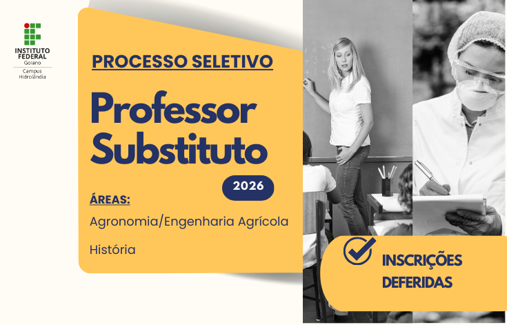 A Comissão de Processo Seletivo para contratação de Professor Substituto (Áreas: Agronomia/Engenharia Agrícola e História) do Campus Hidrolândia torna pública a lista de inscrições deferidas relativa ao certame de ambas as áreas.