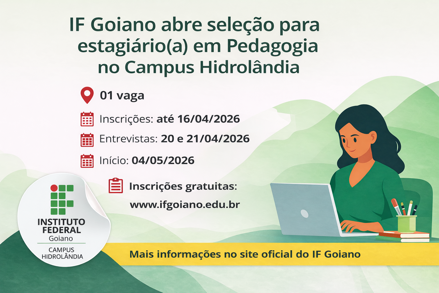 O Instituto Federal Goiano (IF Goiano) torna pública a abertura de seleção para 01 vaga de estágio não obrigatório destinada a estudantes do curso de Pedagogia (nível superior), para atuação no Campus Hidrolândia (GO).