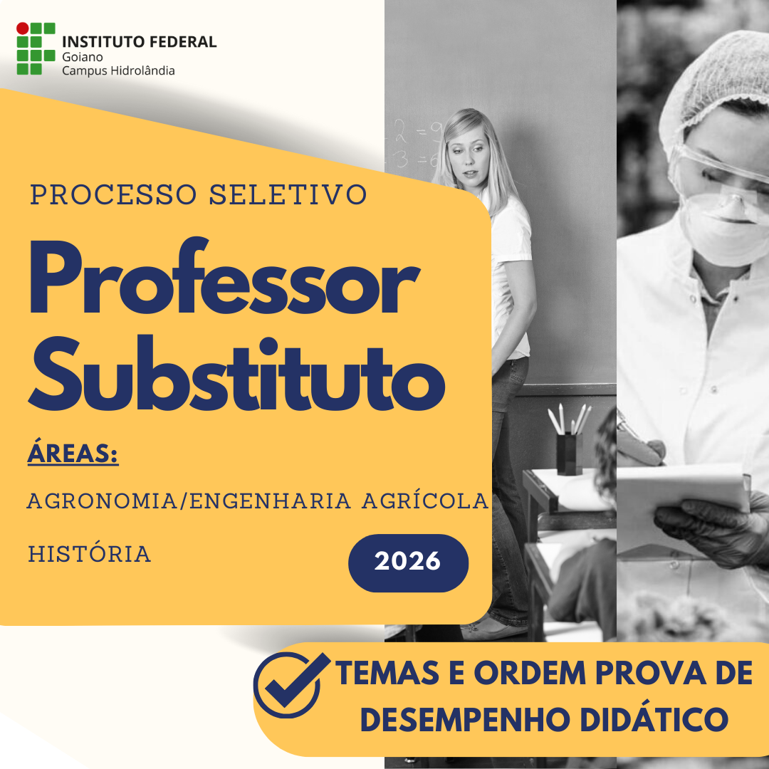 A Comissão Responsável pelo Processo Seletivo Simplificado para contratação de Professores(as) Substitutos(a)s das áreas de Agronomia/Engenharia Agrícola e História do Campus Hidrolândia torna público os respectivos temas e ordem dos candidatos sorteados para a prova de desempenho didático que ocorrerá, amanhã, dia 12 de fevereiro, no Campus Hidrolândia, a partir das 08h.