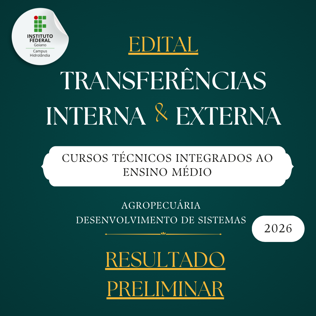 Publicado Resultado Preliminar do processo seletivo de transferências interna e externa para os Cursos Técnicos em Agropecuária e em Desenvolvimento de Sistemas Integrado ao Ensino Médio. As vagas são destinadas aos 2ºs e 3ºs anos desses cursos.