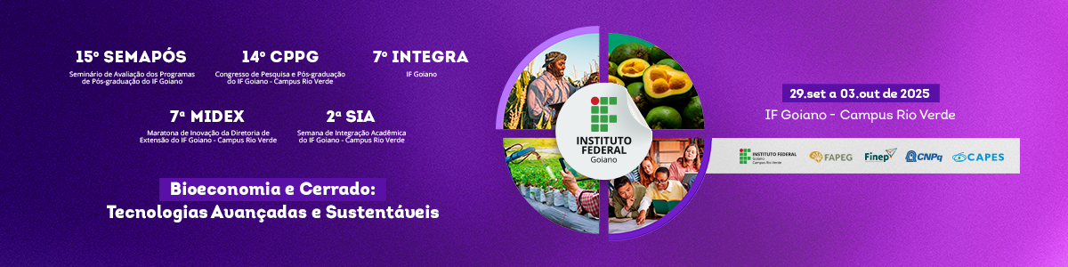 Objetivo: Os Eventos Integrados do IF Goiano unem o 7º Integra, o 15º Seminário de Avaliação dos Programas de Pós-Graduação do IF Goiano (Semapós); a 14º Congresso de Pós-Graduação do IF Goiano – Campus Rio Verde; a 7ª Maratona de Inovação da Diretoria de Extensão do IF Goiano – Campus Rio Verde e a 2ª Semana de Integração Acadêmica do IF Goiano – Campus Rio Verde. O objetivo é fortalecer o ensino, a pesquisa, a pós-graduação, a extensão e a inovação na Instituição por meio da troca de conhecimentos e integração das diversas áreas.