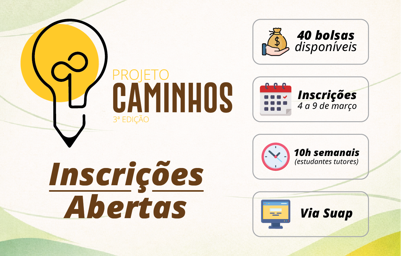 Programa, que está em sua 3ª edição, concede 40 bolsas de R$ 300 mensais a estudantes tutores dos cursos técnicos integrados ao ensino médio. Propostas devem ser enviadas de 4 a 9 de março, via SUAP.