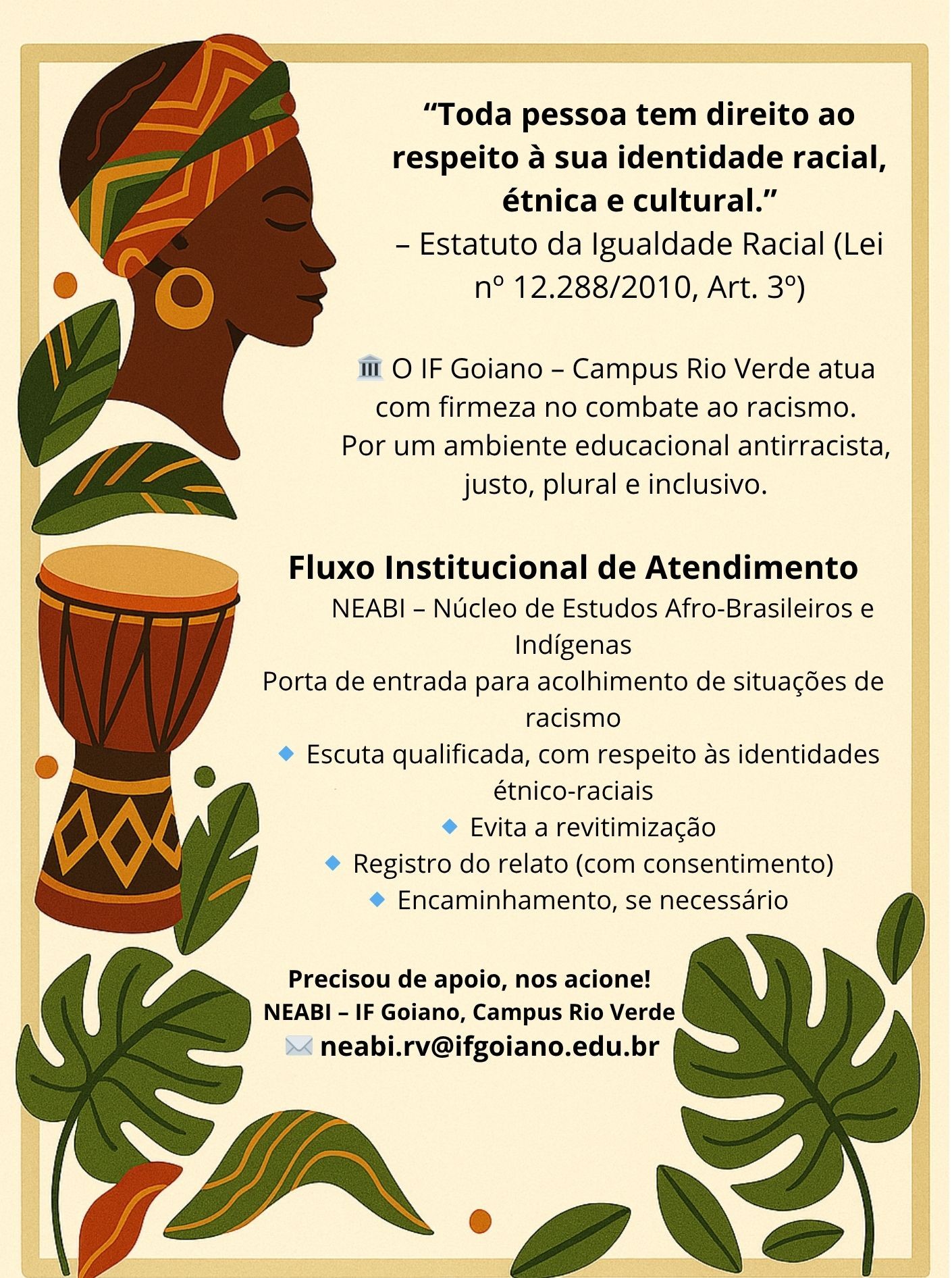 No Campus Rio Verde o Núcleo de Estudos Afro-Brasileiros e Indígenas (NEABI) é coordenadora pela professora Patrícia Caldeira (Este endereço de email está sendo protegido de spambots. Você precisa do JavaScript ativado para vê-lo.)
