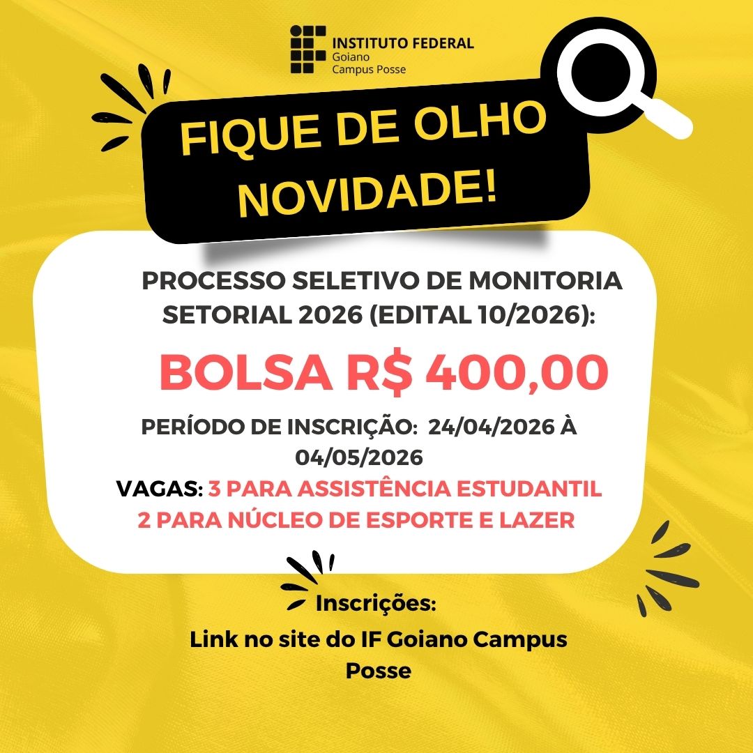 As inscrições para o candidato à monitoria setorial deverão ser feitas por meio de formulário de inscrição online disponível na página do IF Goiano - Campus Posse no período de 24/04/2026 a 04/05/2025, até as 23:59 horas