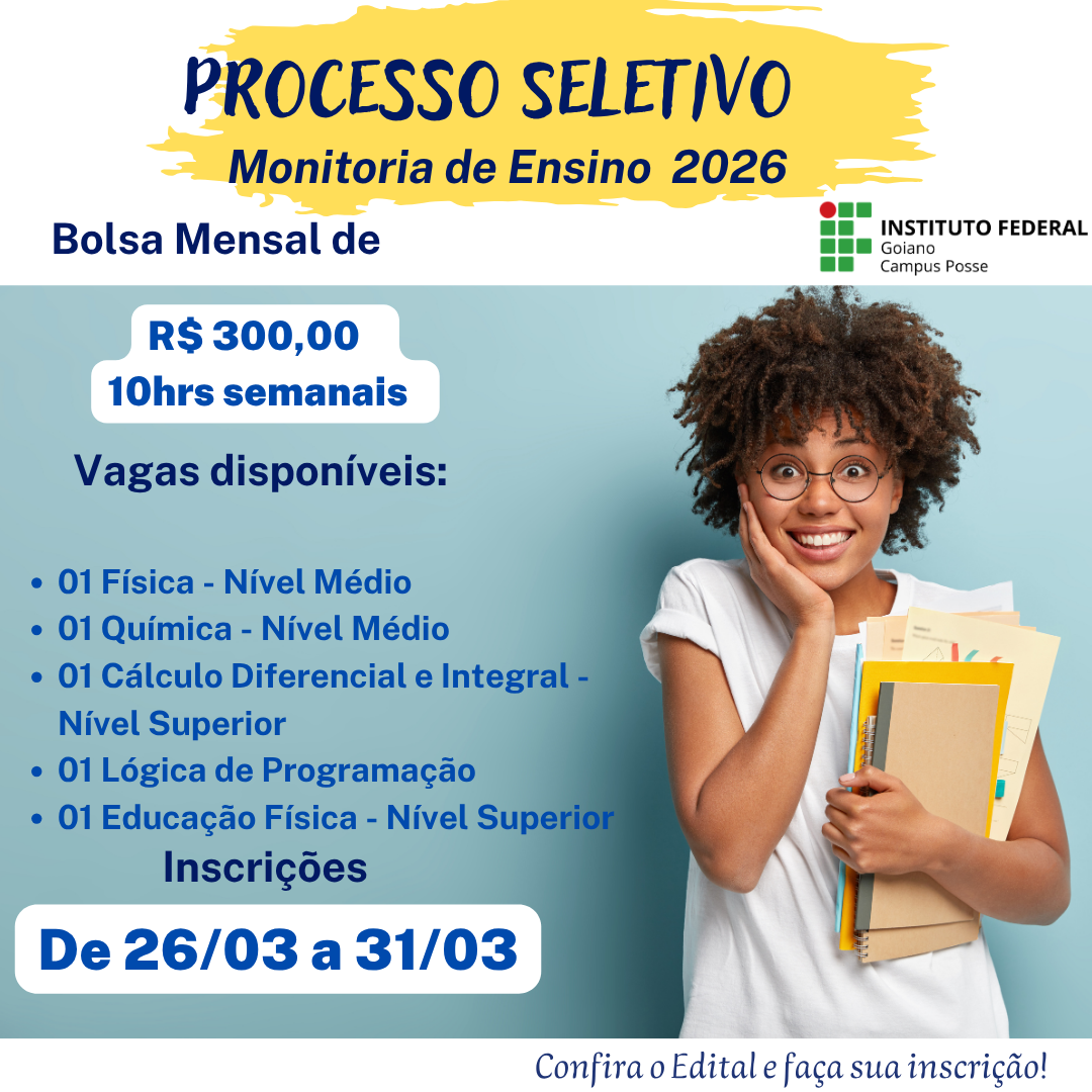 Processo seletivo para o Programa de Monitoria de Ensino. Inscrições: 26/03 a 31/03/2026