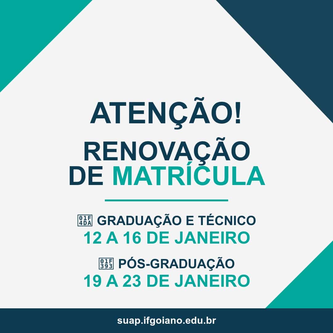 Os alunos dos cursos de graduação e técnicos integrados ao ensino médio devem renovar a matrícula e escolher as disciplinas de 12 a 16 de janeiro. O prazo da pós-graduação é de 19 a 23 de janeiro. Os novos alunos do PS 2026 não precisam renovar matrícula.