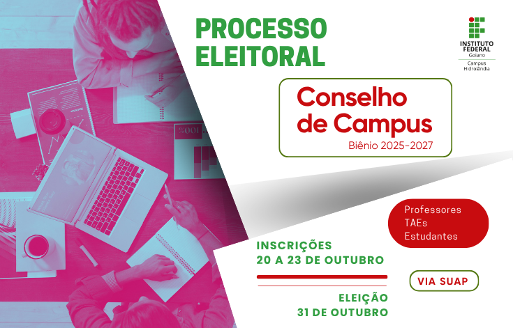 Aberto o Processo Eleitoral para Escolha dos Representantes das Categorias Docente, Discente e Técnico Administrativo do Conselho do Campus Hidrolândia, que constituirá a nova...