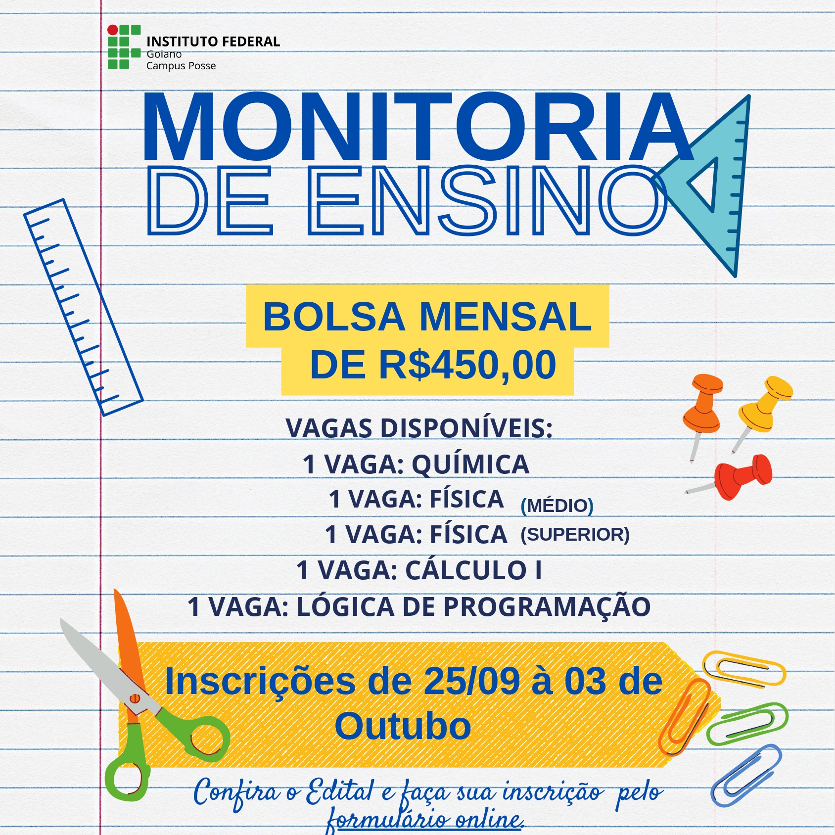 Serão ofertadas 5 bolsas no valor de R$ 450,00 mensais. As inscrições ficam abertas de 25 de Setembro a 03 de outubro de 2025.