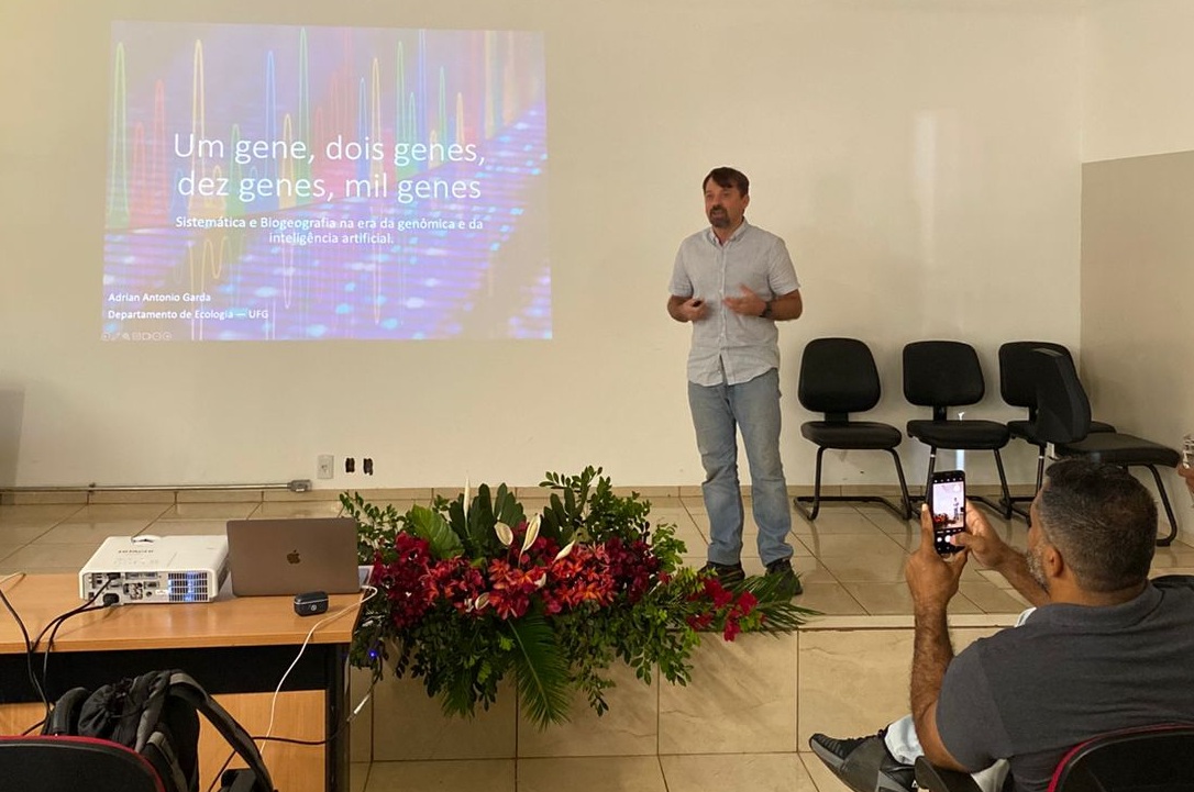 A aula inaugural foi ministrada pelo professor doutor Adrian Antonio Garda, da Universidade Federal do Rio Grande do Norte, com atuação na Universidade Federal de Goiás, que abordou o tema “Um gene, dois genes, dez genes, mil genes: sistemática e biogeografia na era genômica e da Inteligência Artificial”.