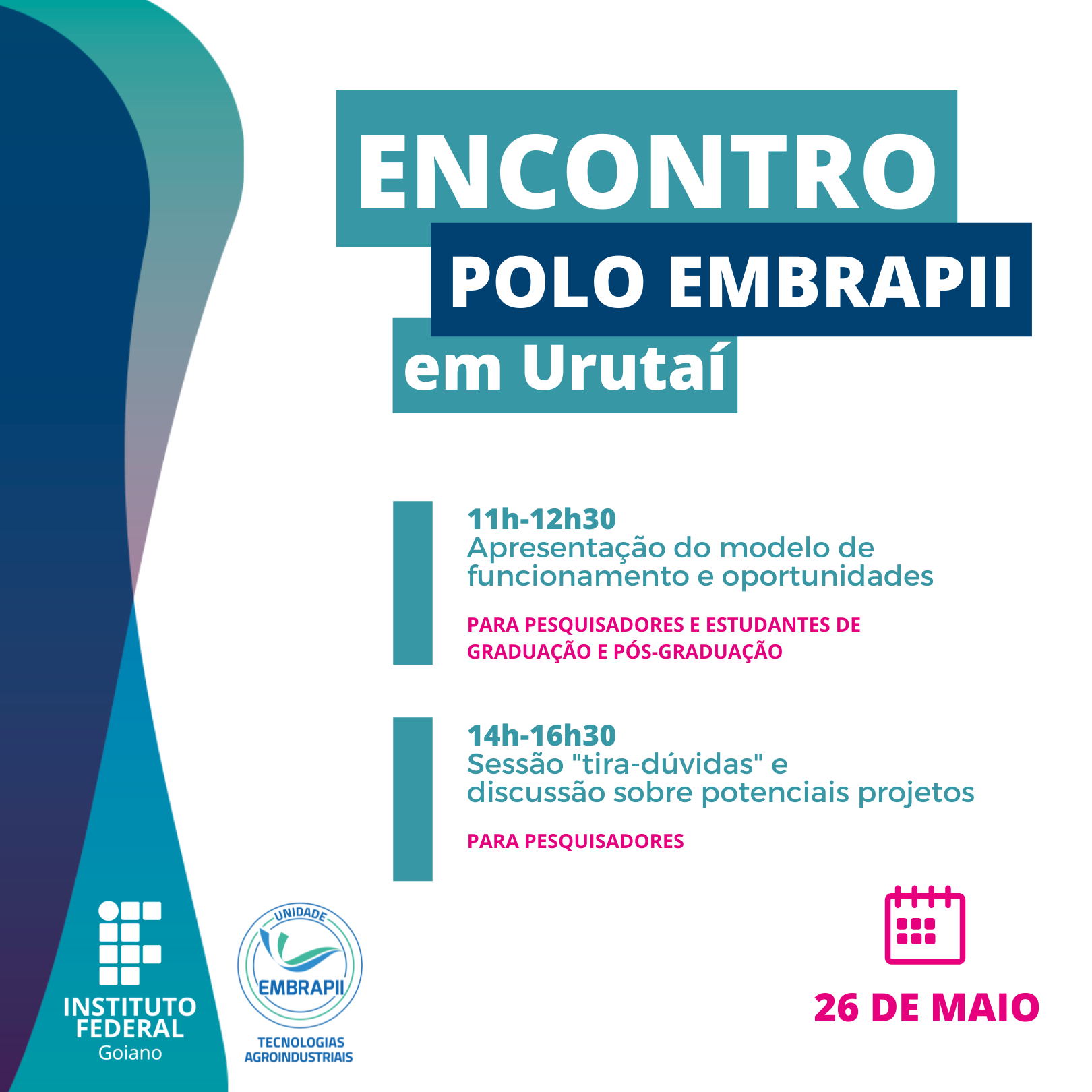 A diretoria de Pesquisa, Pós-Graduação e Inovação do campus Urutaí, convida a todos, servidores e discentes, a participar do encontro Polo EMBRAPII que ocorrerá no dia 26 de maio, no auditório José Costa Júnior ( Prédio da Matemática).
