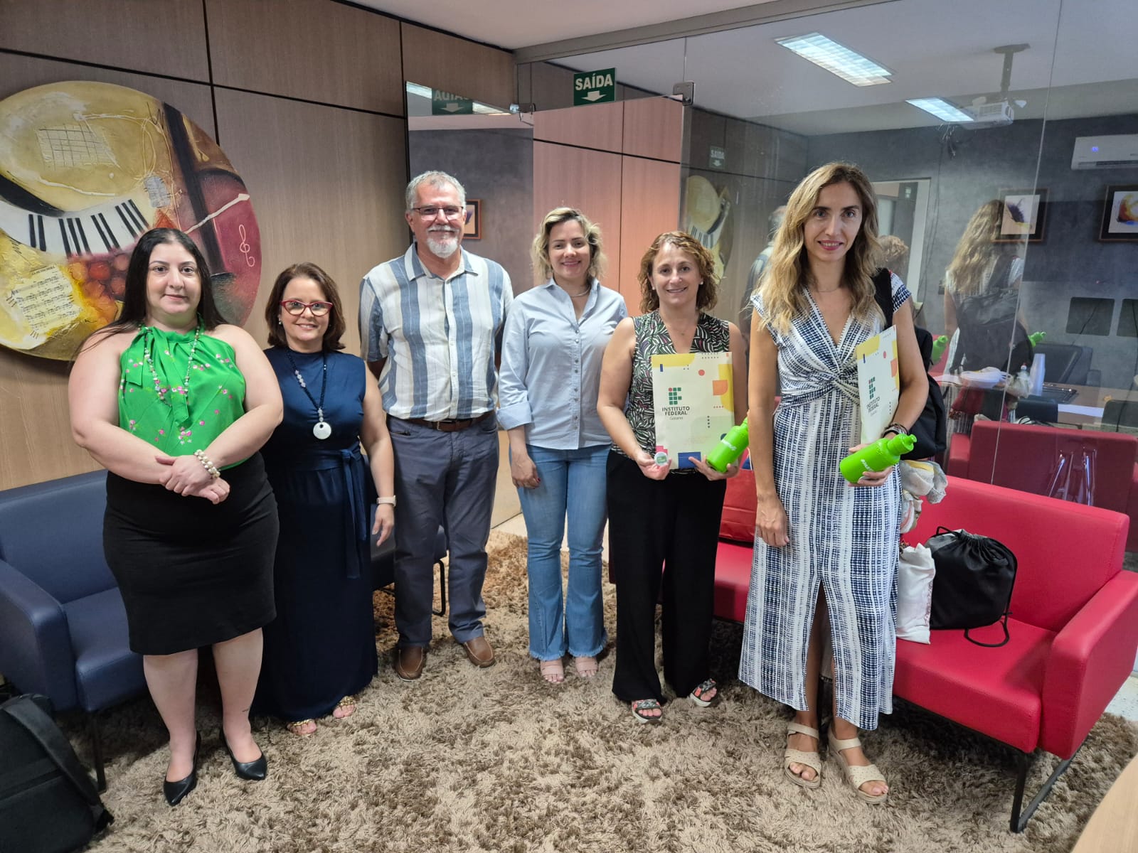 A sessão diplomática foi realizada na sala de reuniões da Reitoria e contou com a presença do reitor substituto, Gilson Dourado, da pró-reitora de Ensino, Geísa Boaventura, e da pró-reitora de Gestão de Pessoas, Ana Maria Rodrigues de Resende. Também participou o professor Flávio Manoel Coelho Borges Cardoso, do Campus Ceres, coordenador da proposta aprovada no edital da FAPEG que possibilitou a vinda das pesquisadoras estrangeiras.