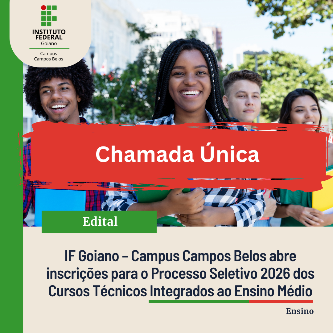 O Instituto Federal Goiano – Campus Campos Belos divulgou a Chamada Única do Processo Seletivo 2026/1 para ingresso nos Cursos Técnicos Integrados ao Ensino Médio, conforme previsto no Edital nº 15/2025.
