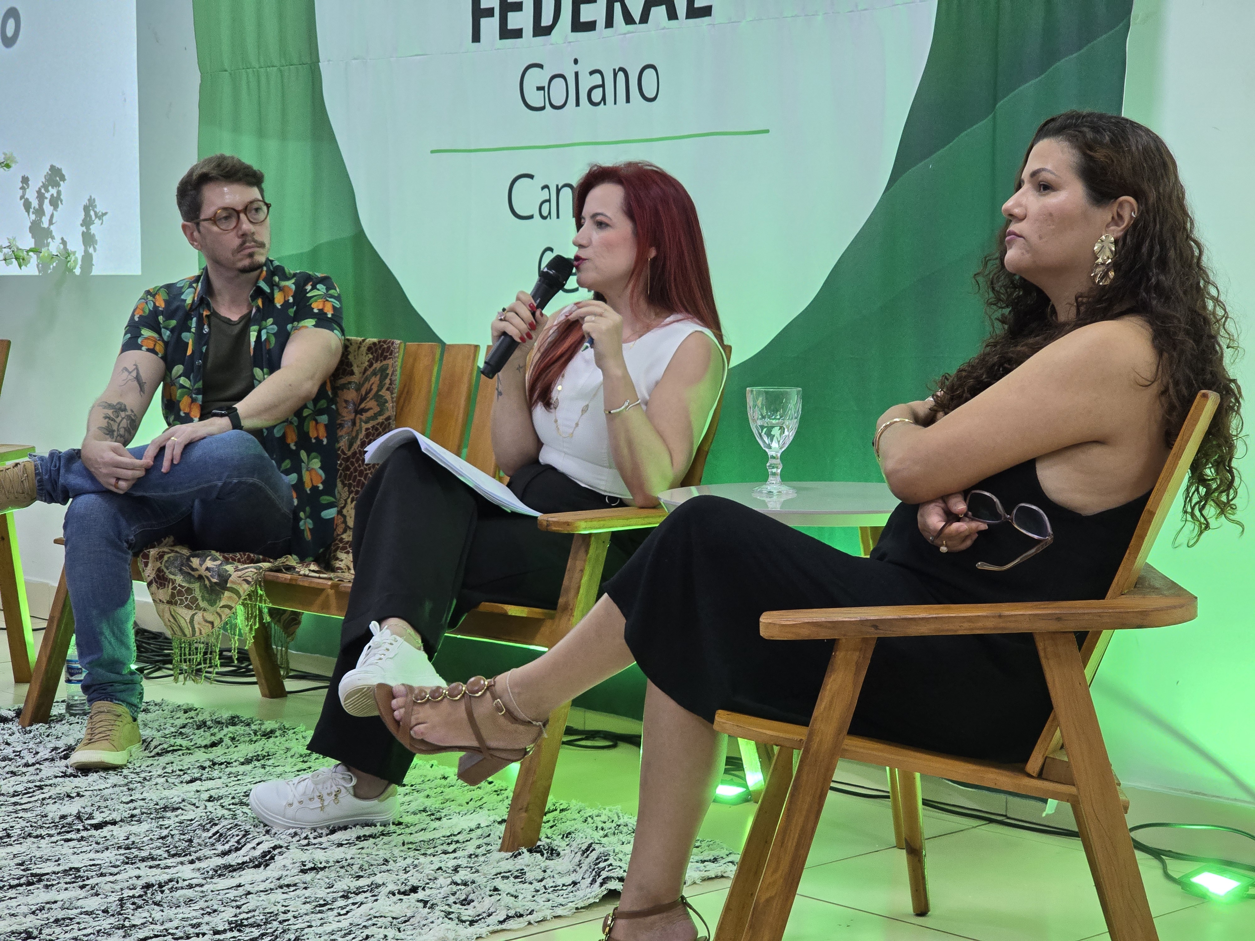 Mesa redonda no 1º dia de evento: Gustavo Ferreira, mediador, Naiane Ribeiro e Simone Firmino