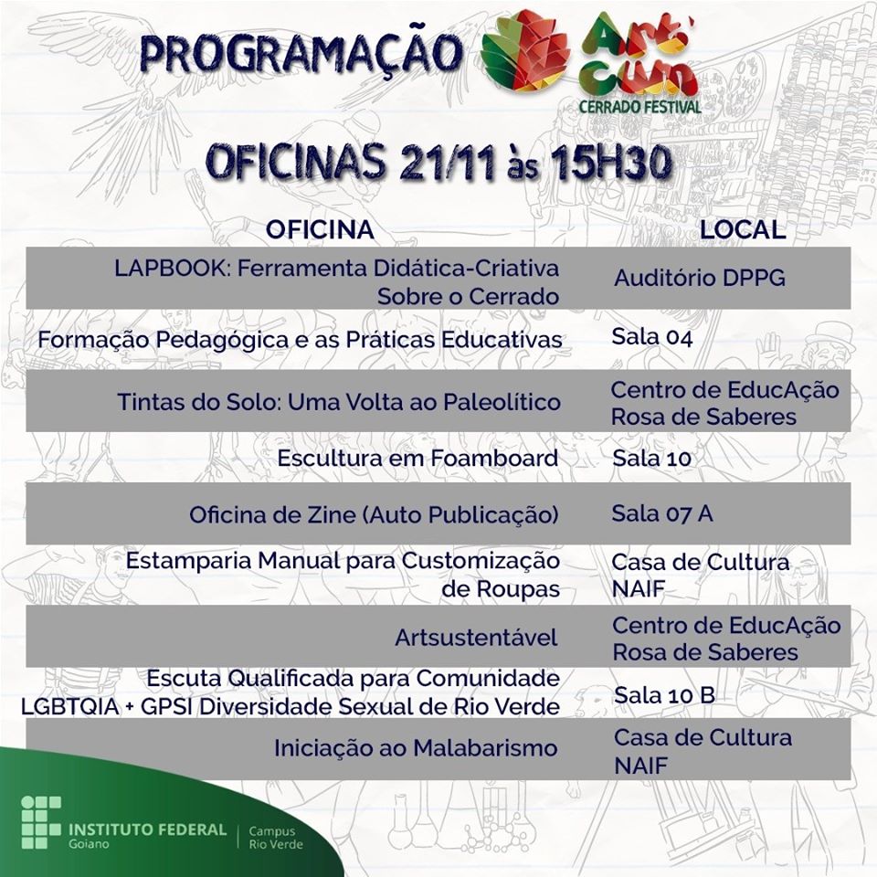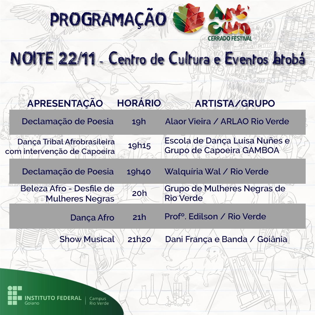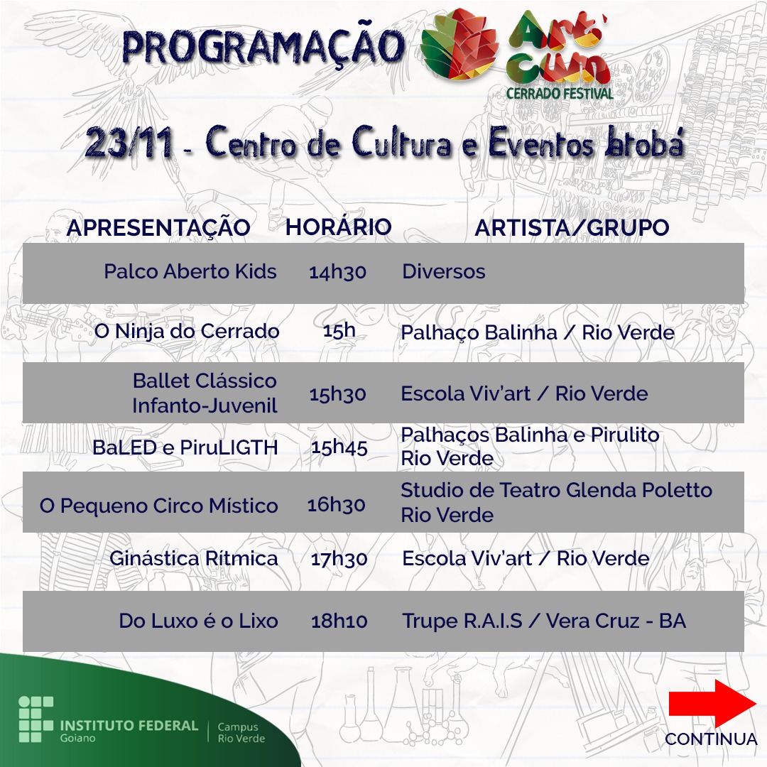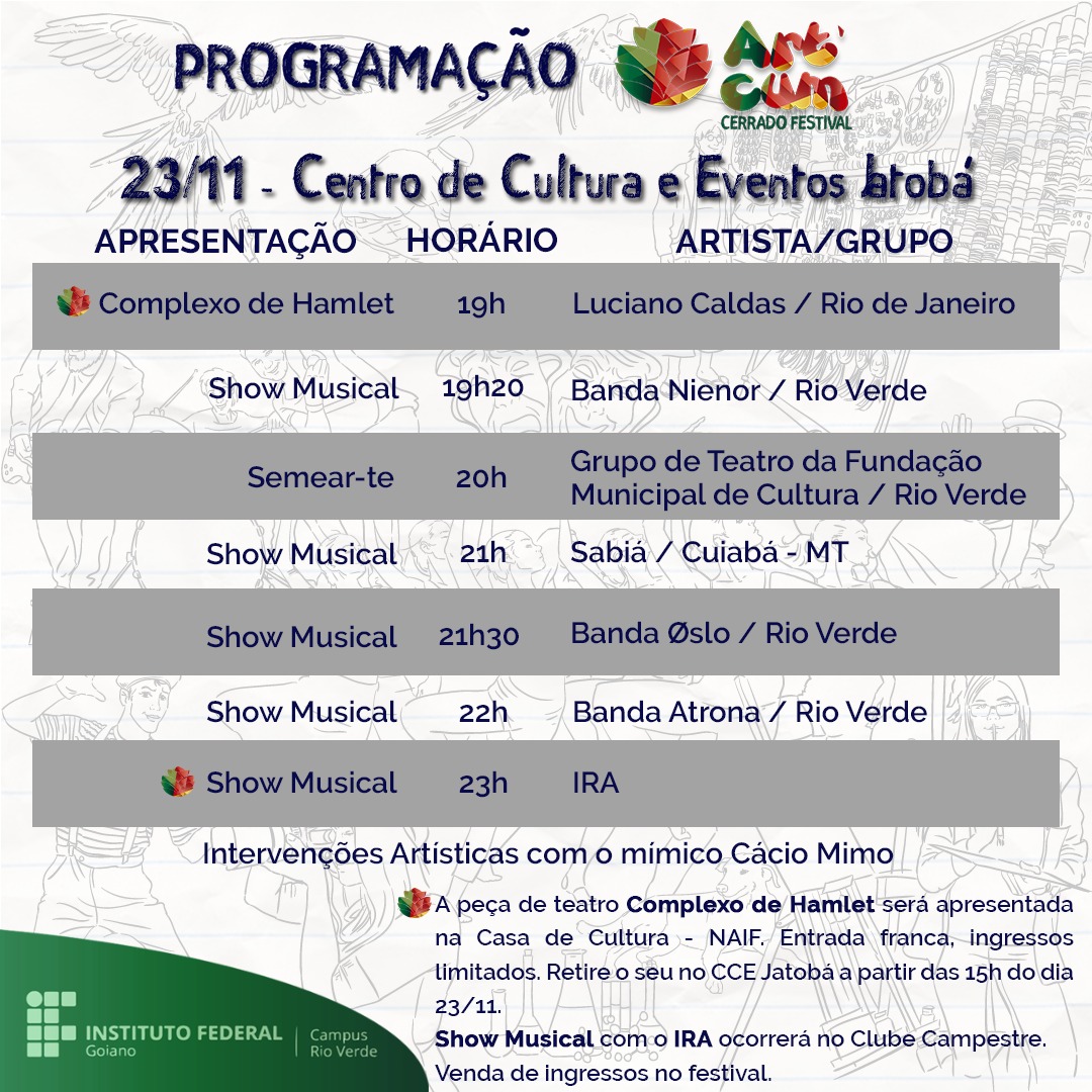 "Conexões" é o tema do festival que acontecerá entre os dias 21 e 23 de novembro. Para os três dias de evento estão programadas diversas atrações, como, shows musicais, espetáculos de dança, teatro, circo, além de oficinas, discussões temáticas acerca da Educação, Ciência, Arte e Cultura por meio de mesas redondas, feiras de artes e ciências, exposições, rodas de conversa e palco aberto.