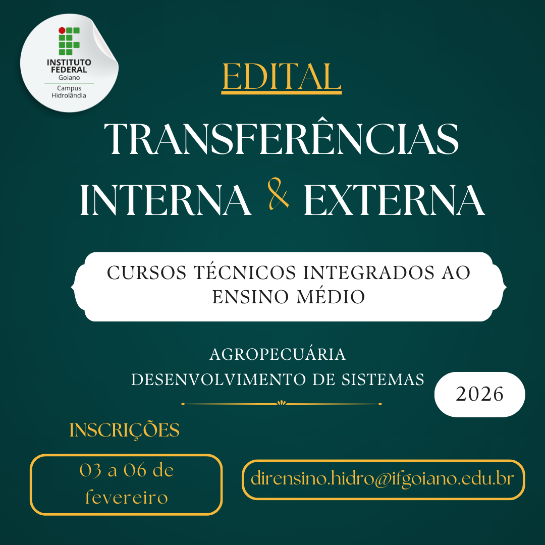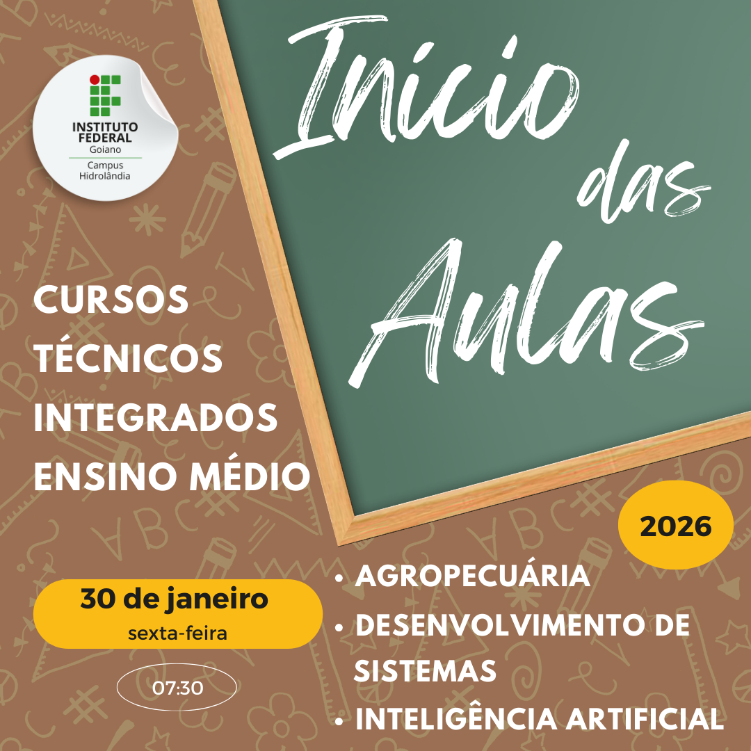 É com muita satisfação que o IF Goiano Campus Hidrolândia informa que amanhã, dia 30 de janeiro de 2026, sexta-feira, iniciaremos as aulas do ano letivo de 2026 para todas as turmas dos Cursos Técnicos Integrados ao Ensino Médio (Agropecuária, Desenvolvimento de Sistemas e Inteligência Artificial). As aulas no período matutino se iniciam às 07h30min e se encerram às 12h30min. Veja, também, os horários do transporte escolar com destino ao Campus Hidrolândia.