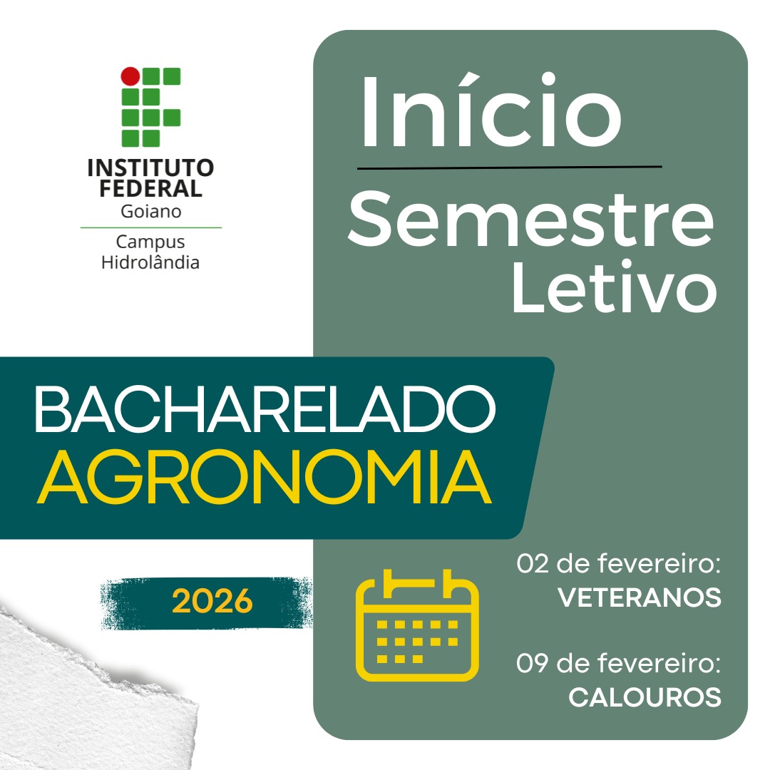 É com satisfação que o IF Goiano Campus Hidrolândia informa aos estudantes ingressantes no Bacharelado em Agronomia que, na próxima segunda-feira, dia 9 de fevereiro, a partir das 7h30min, iniciaremos o ano letivo de 2026 para a turma do 1º Período.