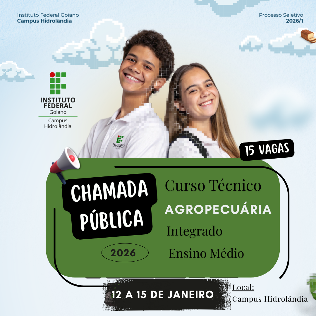 O IF Goiano Campus Hidrolândia torna pública a Chamada Pública destinada ao preenchimento de 15 vagas do 1º ano do Curso Técnico em Agropecuária Integrado ao Ensino Médio. Os interessados em estudar no IF deverão se dirigir ao Campus Hidrolândia, juntamente com seu responsável, entre os dias 12 e 15 de janeiro de 2026, das 07h30m às 13h, com a documentação necessária para realizarem a matrícula nesse curso.