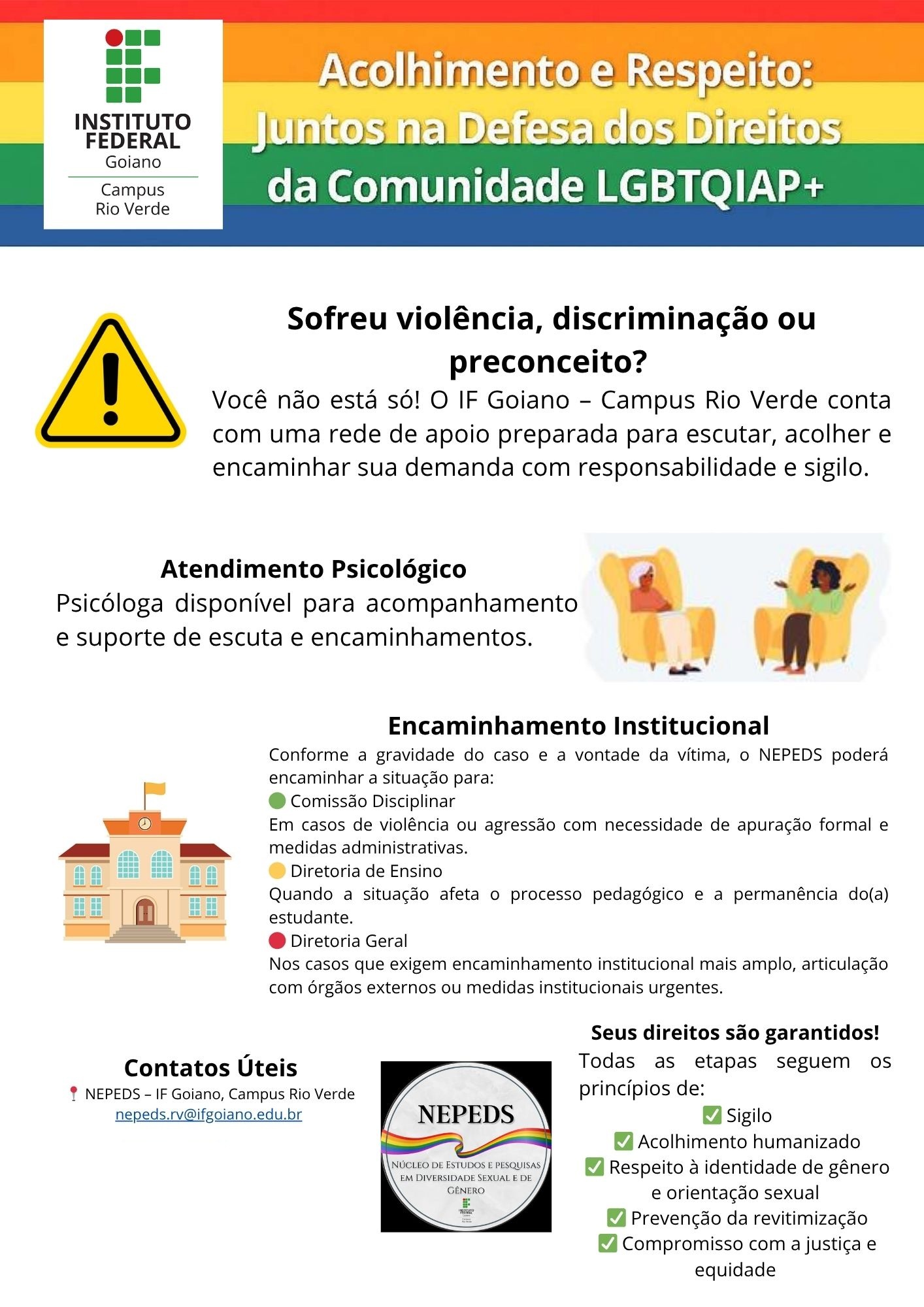 O Núcleo de Estudos e Pesquisas em Diversidade Sexual e de Gênero do Instituto de Educação, Ciência e Tecnologia Goiano - NEPEDS/IF Goiano, vinculado a Pró- Reitoria de Ensino, em articulação com as Pró- Reitorias de Pesquisa e Extensão do IF Goiano, instituído na reitoria, em fevereiro de 2018, pela RESOLUÇÃO Nº 037/ de 23/02/2018 e em cada campus do IF Goiano, designado por Portaria, é um setor propositivo e consultivo que estimula e promove ações de Ensino, Pesquisa e Extensão, orientadas a estudos e práticas em educação da diversidade sexual e de gênero no âmbito da Instituição e em suas relações com a comunidade externa.