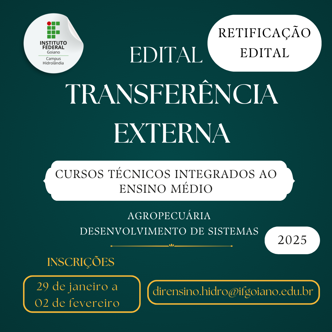 Publicada retificação do Edital nº 03/2025 referente ao processo seletivo de transferência externa para os Cursos Técnicos em Agropecuária e em Desenvolvimento de Sistemas Integrado ao Ensino Médio. A retificação está relacionada ao cronograma do edital. Confira as datas que mudaram. As vagas são destinadas aos 2ºs e 3ºs anos desses cursos. Poderão se inscrever estudantes de outros campi do IF Goiano e de outras unidades de Institutos Federais da Rede Federal de Educação Profissional.