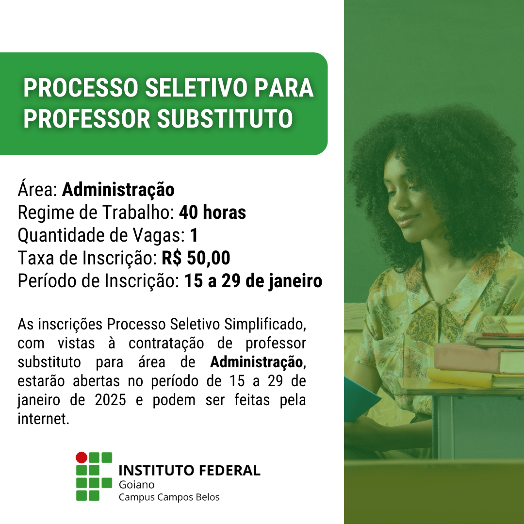 Inscrições gratuitas de 1º a 15 de setembro para 80 vagas em Administração e Agropecuária, turno noturno, duração de 3 semestres, presencial. Ingresso por sorteio público em 19 de...