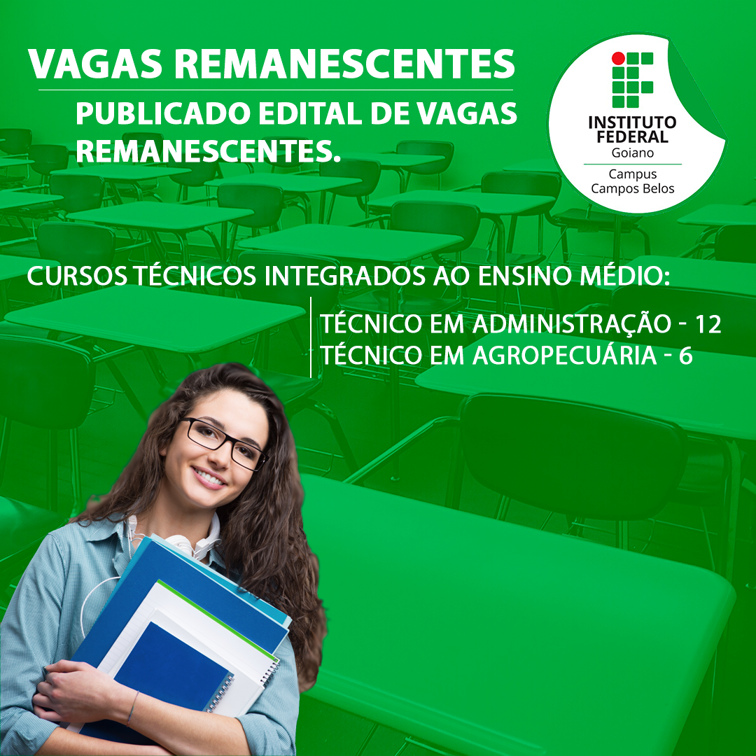 Publicado Edital para o preenchimento de vagas remanescentes dos cursos de Técnico de Agropecuária Integrado ao Ensino Médio e Técnico em Administração Integrado ao Ensino Médio. As...