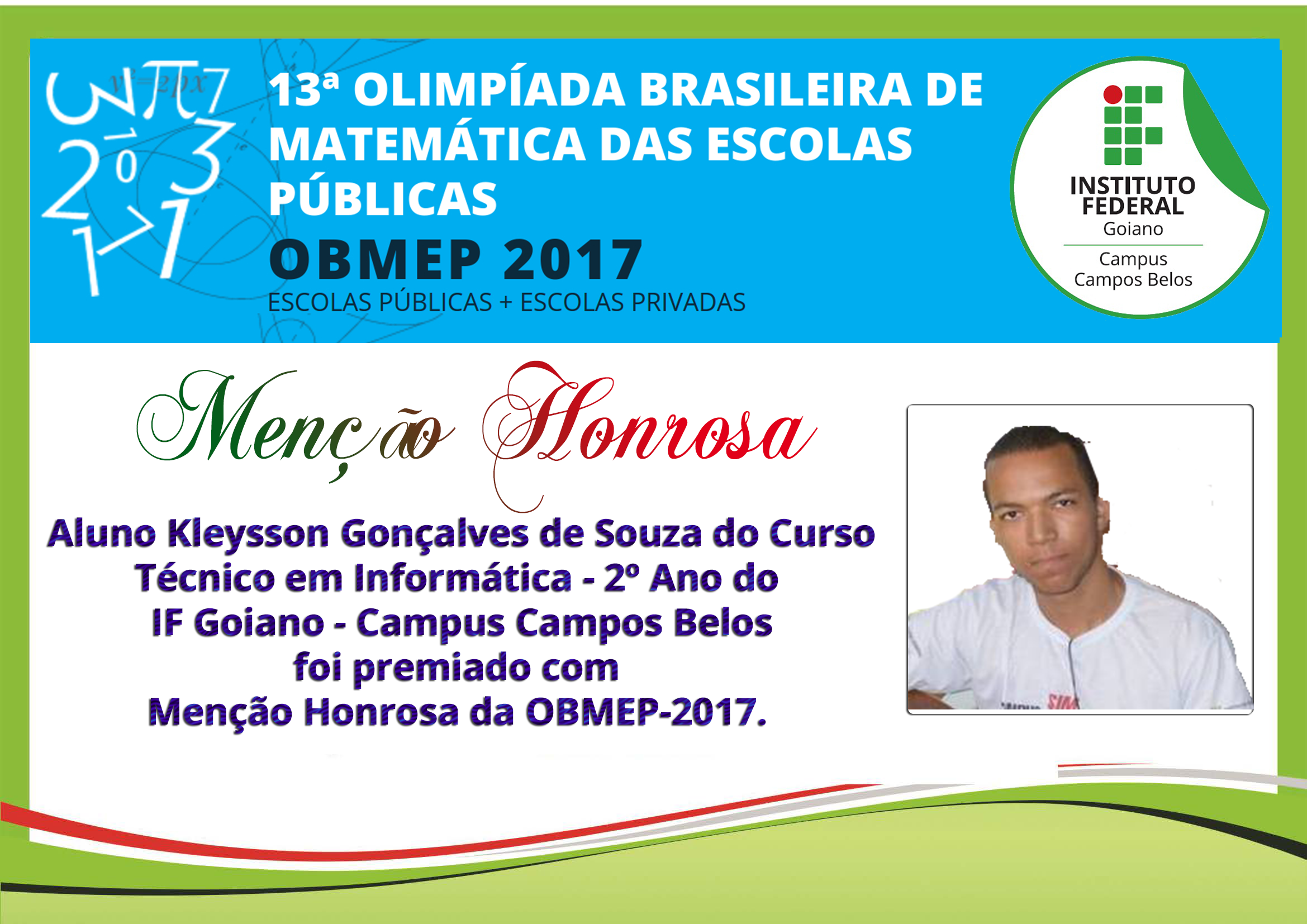 Kleysson Gonçalves de Souza, aluno do Curso Técnico em Informática -2º Ano foi certificado com Menção Honrosa na 13ª Olimpíada Brasileira de Matemática, nível 3.