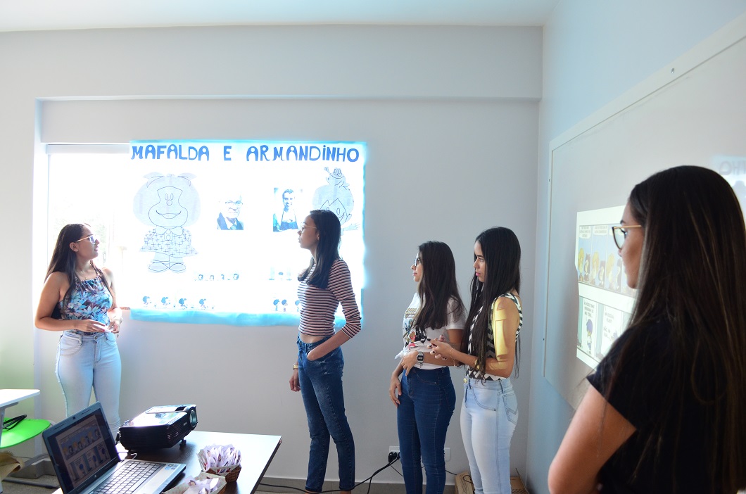 Nas duas primeiras fotos, apresentações dos estudantes sobre literatura e línguas portuguesa e espanhola. Na foto logo acima, palestra do professor Cléber Silva sobre a leitura cidadã