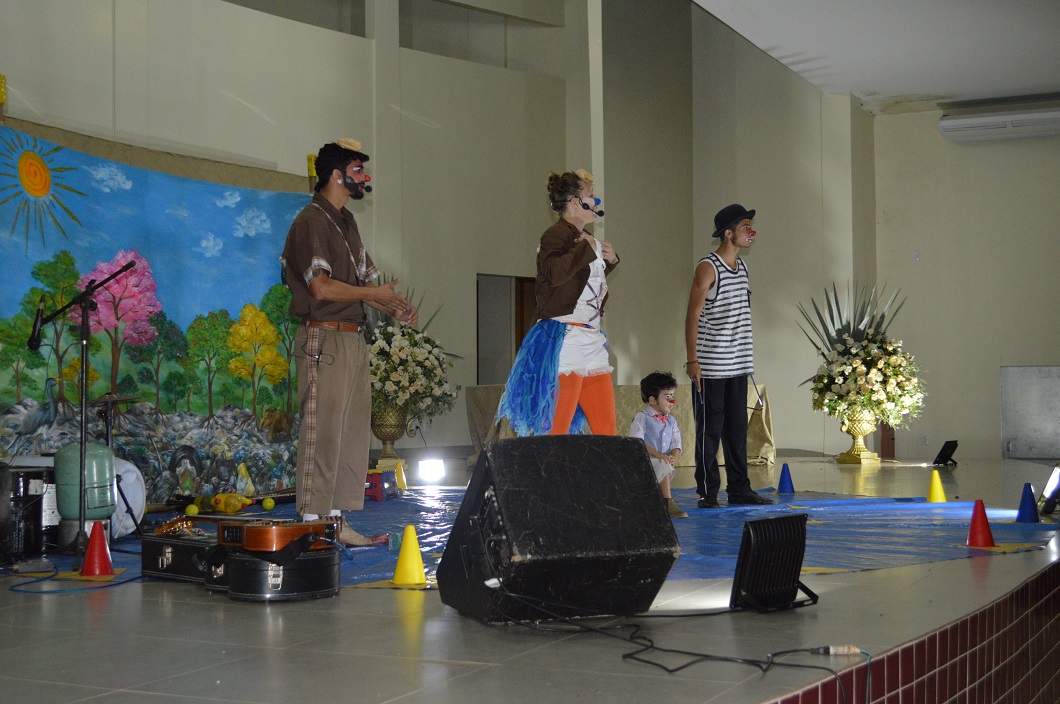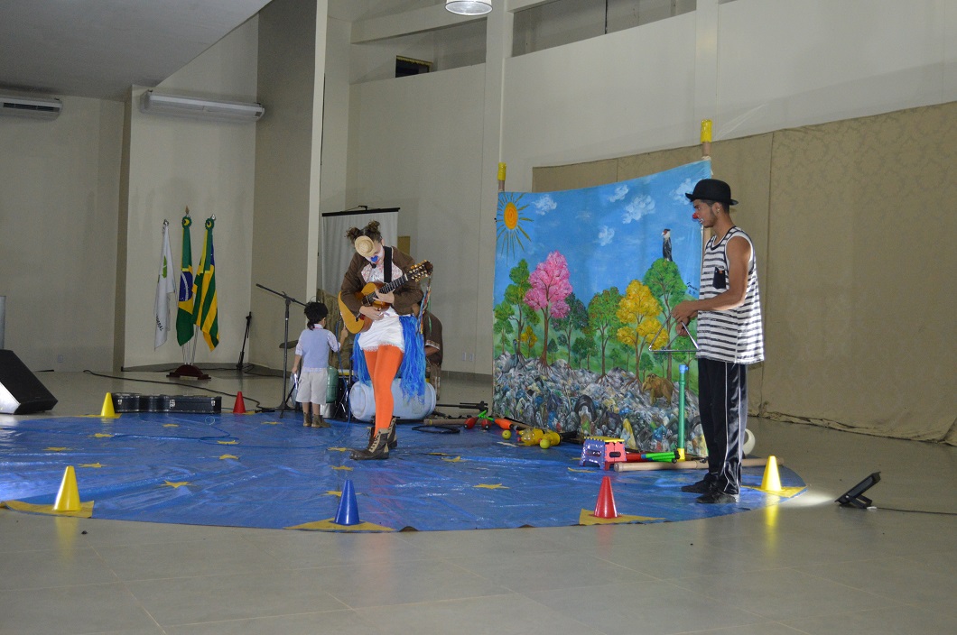 Humor com inteligência – A noite foi encerrada com risadas e reflexões importantes, promovidas pela Companhia de Teatro Boca do Lixo. O grupo, originário de Anápolis (GO), trabalha com a formação de jovens nas artes circenses e apresentou um espetáculo que envolveu malabarismos, músicas e crítica social e ambiental. A começar pelos instrumentos, todos feitos a partir de materiais recicláveis, e sobre os quais os palhaços Mutamba e Seriema davam as dicas de confecção. Baldes, latões, panela de pressão e vasilhame de gás GLP se transformaram em uma bateria, que de convencional só tinha mesmo os pratos, ainda assim, reciclados. As claves de malabares, da mesma forma, foram feitas com garrafas PET, cabos de vassoura e tiras de câmara de ar.