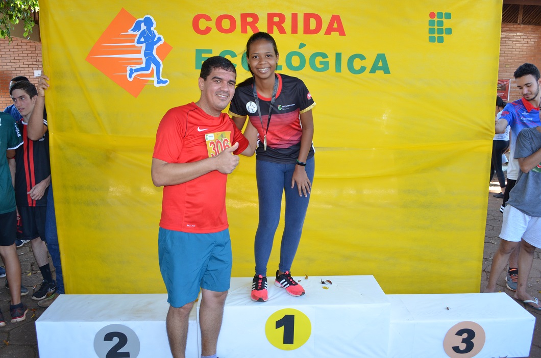 Acima, o diretor-geral do Campus Ceres, Cleiton Mateus, que participou da Corrida, premia a vencedora da categoria Graduação e Pós-Graduação, Sabrina Dias