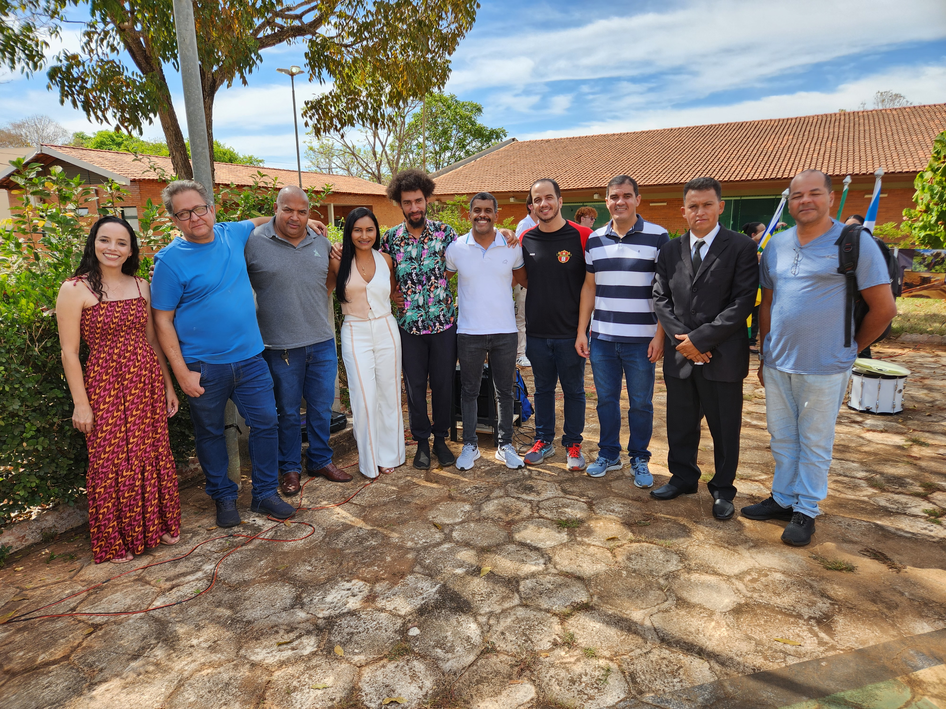 Equipe e convidados do 4º Workshop de Bandas e Fanfarras do Vale de São Patrício. Ao centro, Leandro Simplício (de branco), presidente da AGBF, Hugo Campos (de preto), coordenador do evento, e Cleiton Mateus (de listrado), diretor-geral do Campus Ceres
