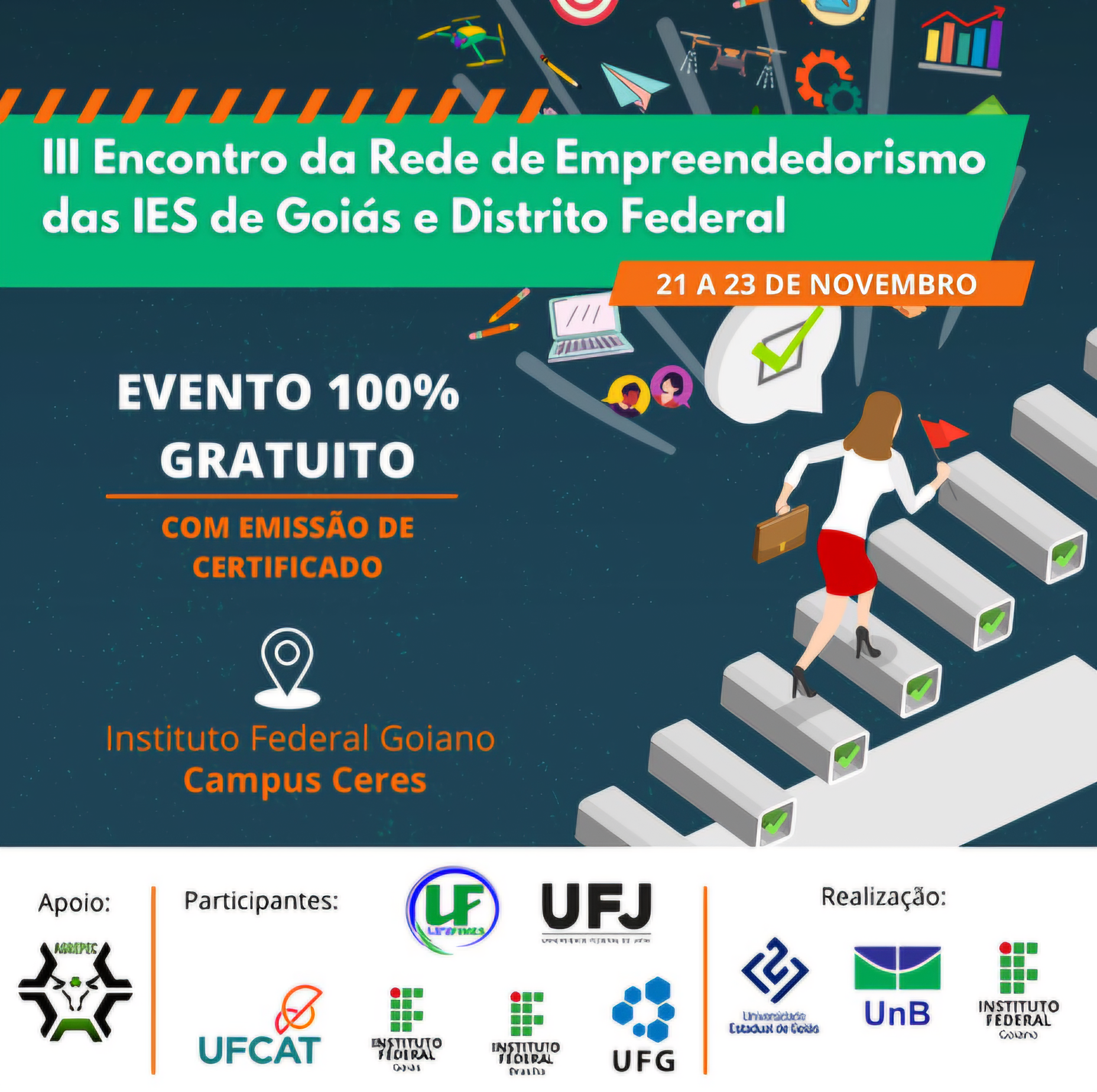 O Campus Ceres do Instituto Federal Goiano (IF Goiano) abre nesta terça-feira, 17 de setembro, as inscrições (veja abaixo) para o III Encontro da Rede de Empreendedorismo das IES de Goiás e Distrito Federal. O evento é gratuito e voltado para os participantes de empresas juniores e outras iniciativas do gênero, o será realizado entre 21 e 23 de novembro, aqui na unidade.