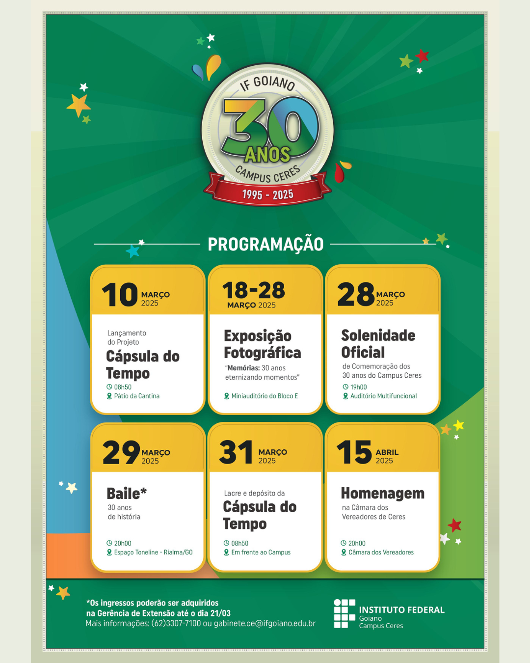 Integram ainda as festividades o baile 30 anos de história, que ocorrerá no dia 29 de março, com início às 20h, destinado a servidores e estudantes dos cursos de graduação e pós-graduação, e a sessão de homenagem ao Campus Ceres na Câmara de Vereadores do município, em 15 de abril. Interessados em adquirir os ingressos do Baile devem procurar a Gerência de Extensão ou a Diretoria de Administração e Planejamento da unidade.