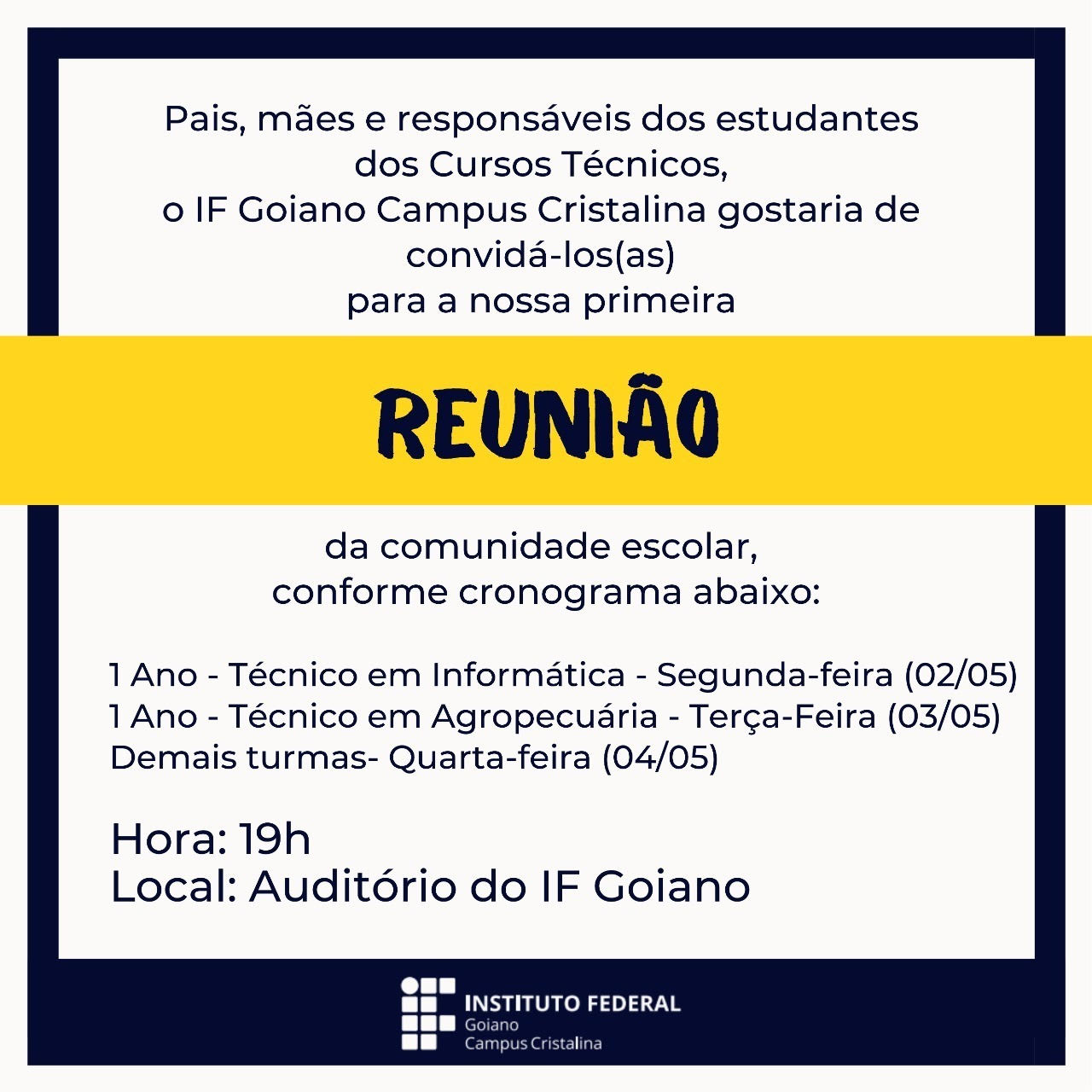 O Instituto Federal Goiano – Campus Cristalina. Convida a Comunidade Escolar (Pais, mães e responsáveis), para nossa primeira reunião de 2022