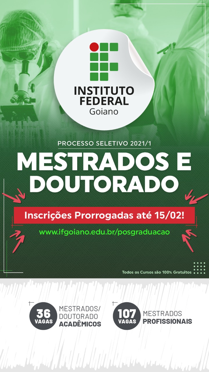 Atenção: foram prorrogas as inscrições do processo seletivo para mestrados e doutorado do IF Goiano. Novo prazo vai até 15 de fevereiro!