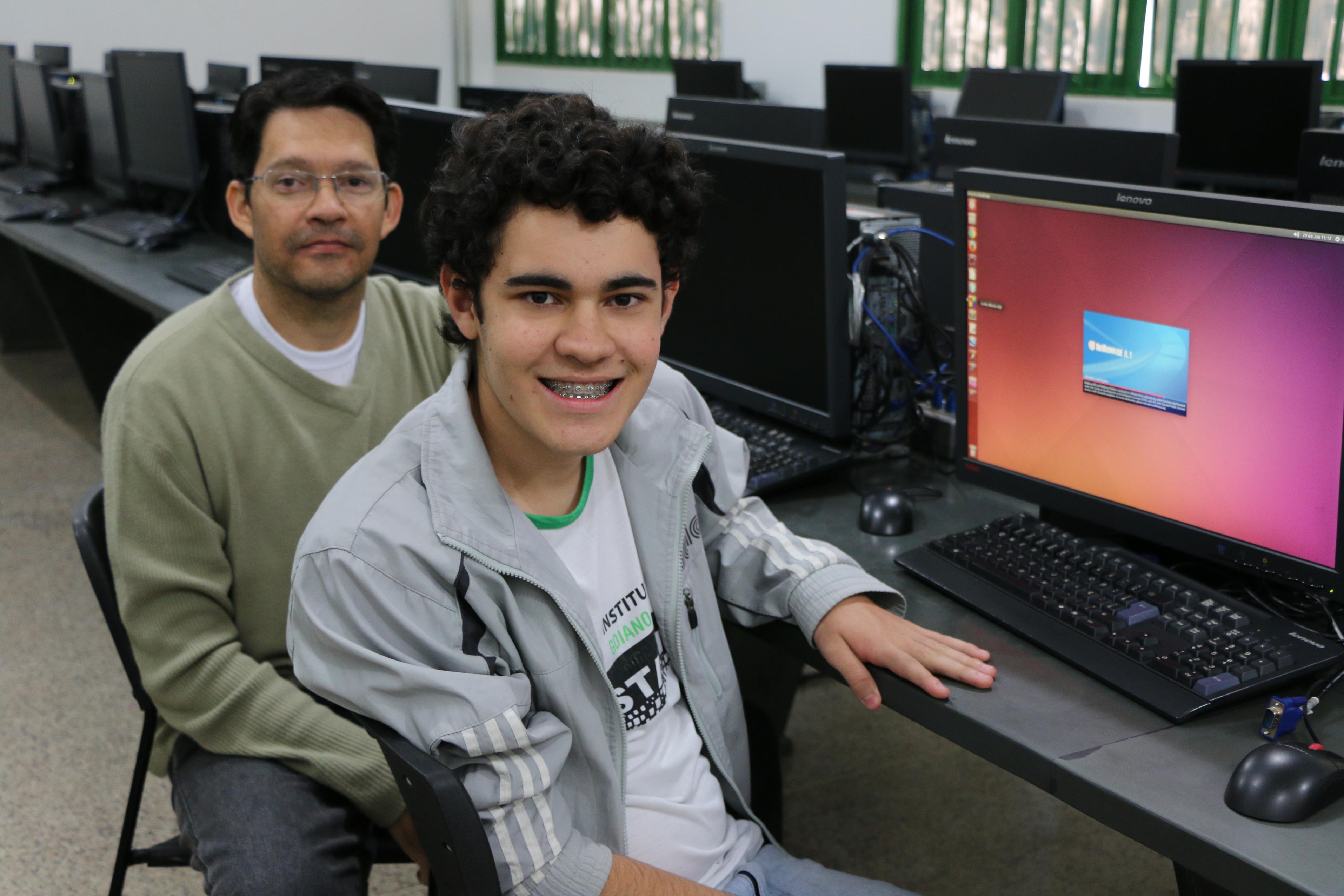 Aprovado na 1ª fase do vestibular da Universidade Federal de Uberlândia - UFU, Gabriel França de Almeida, aluno do 3º ano do Curso Técnico em Informática do IF Goiano Campus Avançado Cristalina, aguarda "ansiosamente" a 2ª fase do exame, como diz o Prof. Tony Medeiros que está ao seu lado na foto abaixo. Concorrer a uma vaga para o Curso de Engenharia da Computação, em uma Universidade Federal, Gabriel é inspiração e exemplo para os demais alunos do terceiro ano da Instituição.