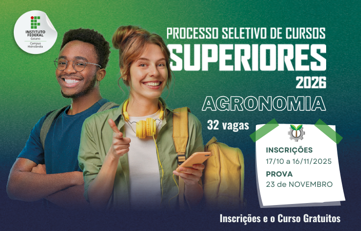 O IF Goiano Campus Hidrolândia abre vagas para o Curso de Bacharelado em Agronomia, ingresso no ano letivo de 2026/1. São 32 vagas e as inscrições do Processo Seletivo vão de 17 de...