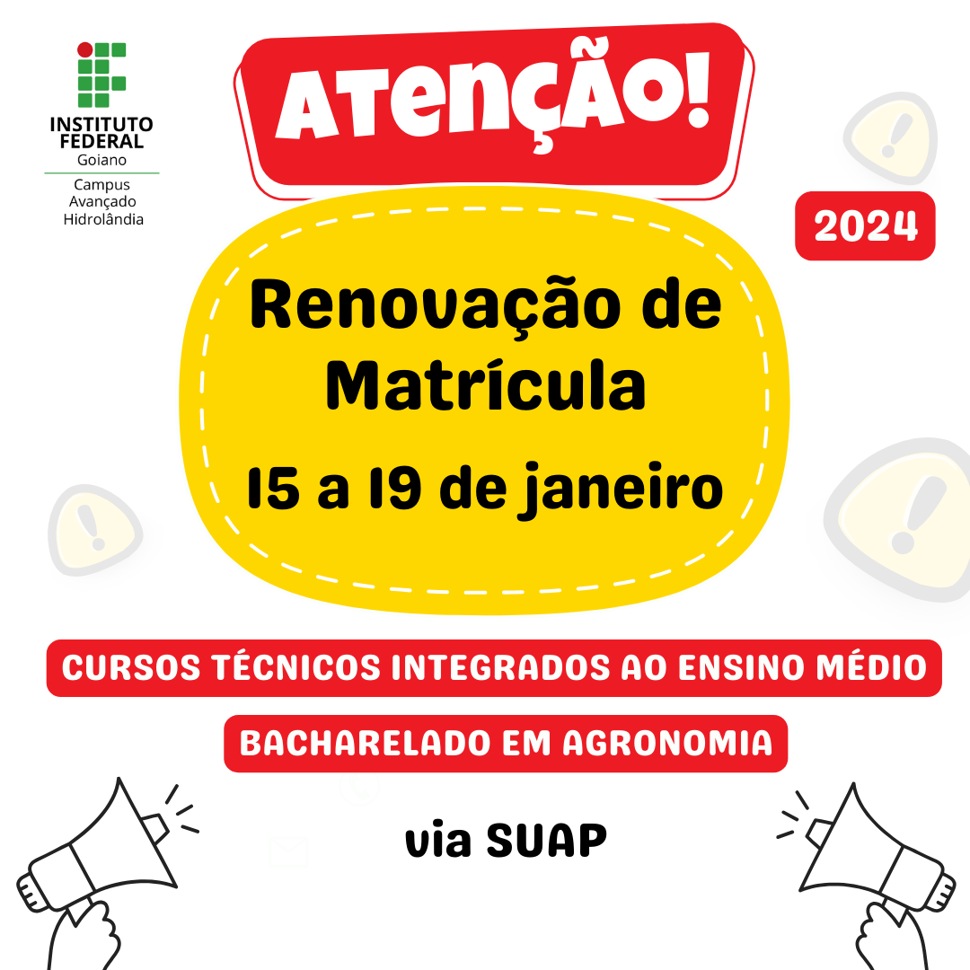 O IF Goiano Campus Avançado Hidrolândia informa aos estudantes veteranos dos Cursos Técnicos Integrados ao Ensino Médio (Agropecuária e Desenvolvimento de Sistemas) e do Bacharelado em...