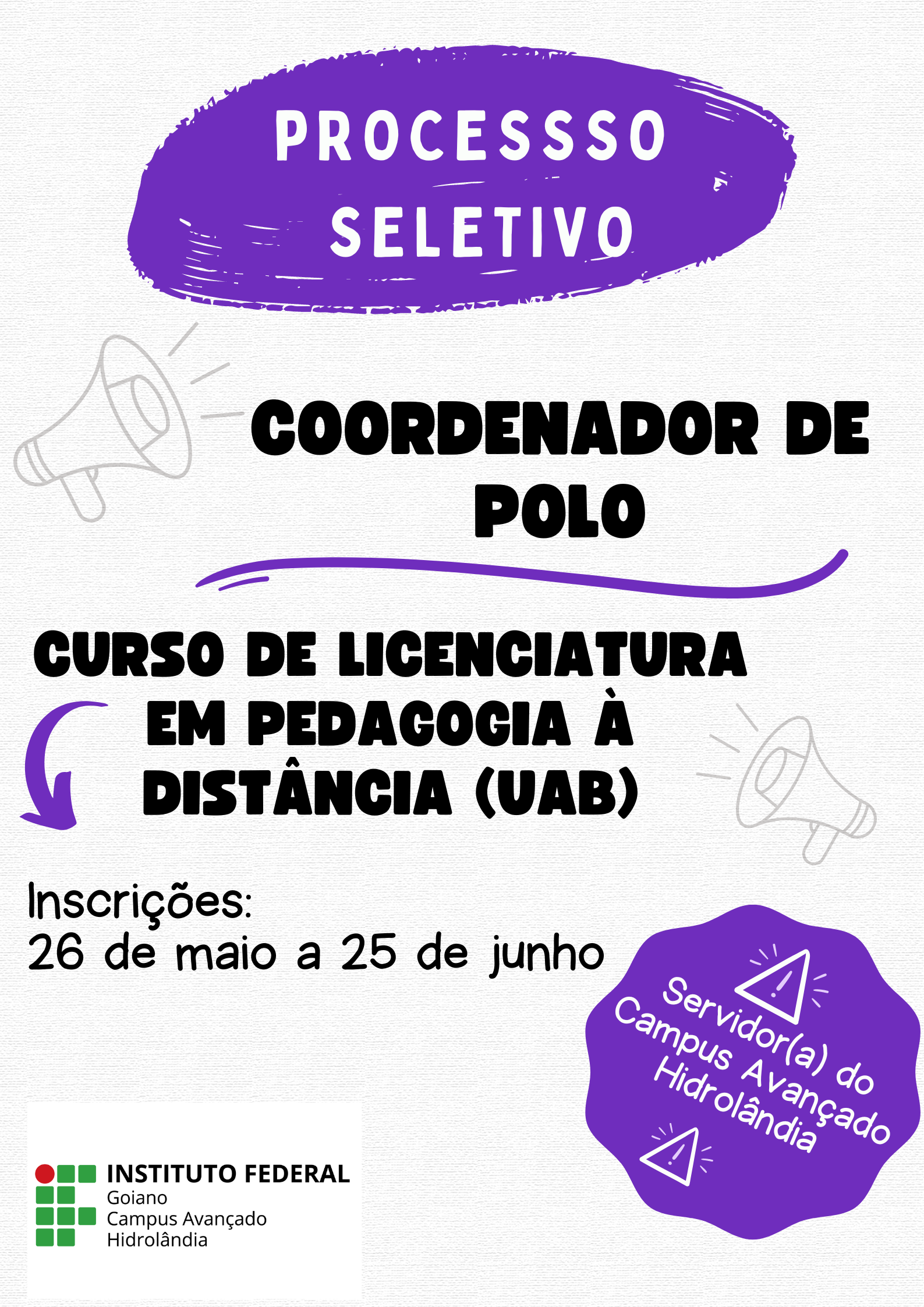 A comissão responsável pela Seleção de Bolsista do Curso de Licenciatura em Pedagogia pela UAB para função de Coordenador de Polo do Campus Avançado Hidrolândia torna público o...