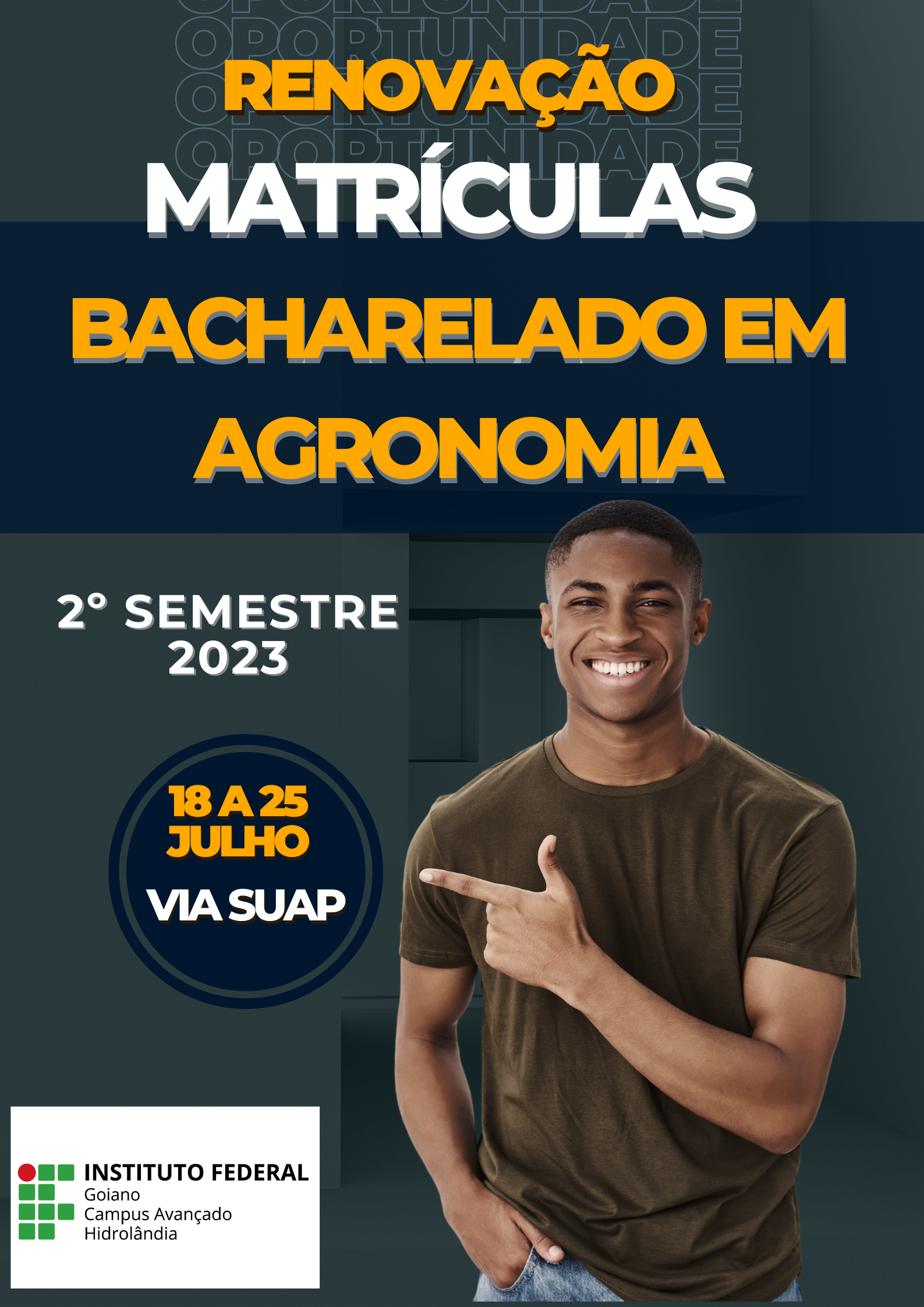 Entre os dias 18 e 25 de julho, os acadêmicos do Bacharelado em Agronomia poderão renovar a matrícula e escolher as disciplinas para o 2º semestre de 2023.