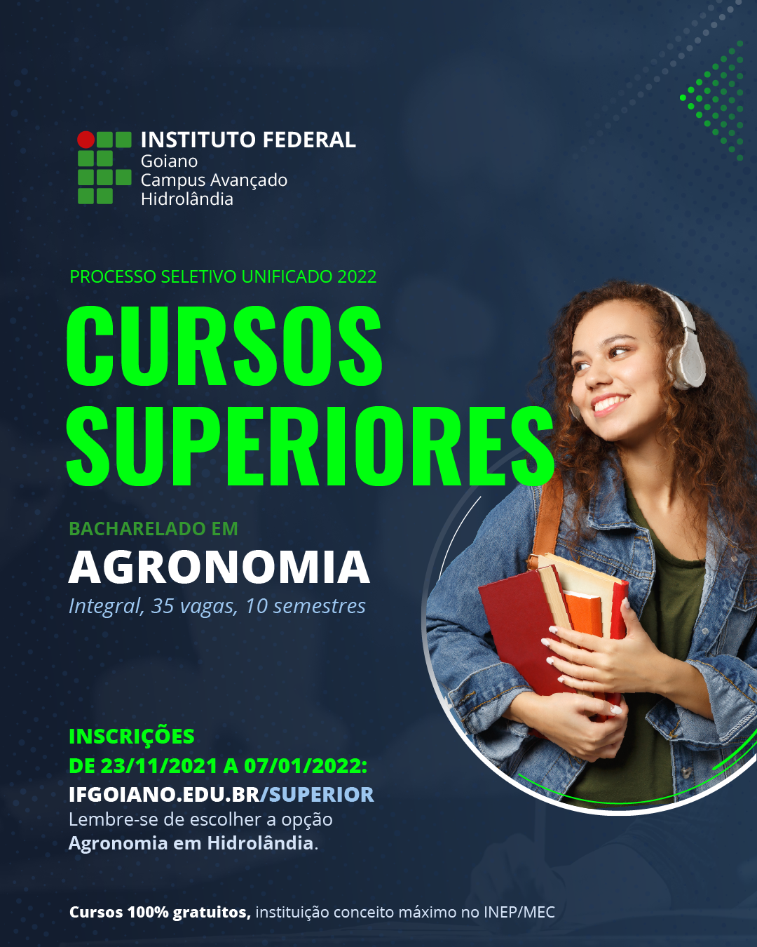 Novo prazo vai até 20 de janeiro. A seleção se dá por meio da nota do Exame Nacional do Ensino Médio (Enem) dos anos de 2019, 2020 ou 2021. O Bacharelado em Agronomia ofertado pelo...