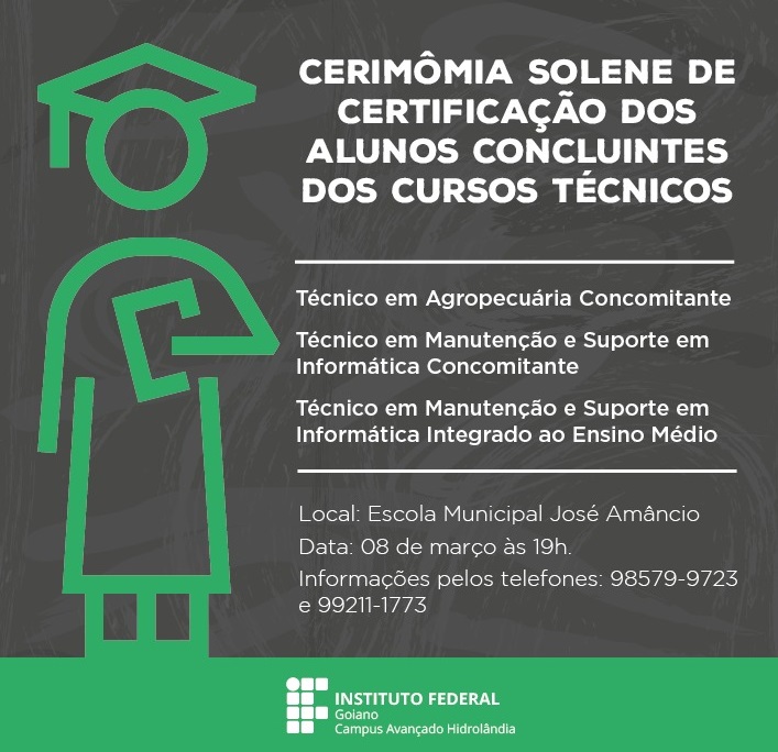 Os candidatos selecionados deverão realizar matrícula entre os dias 08 e 12 de janeiro de 2018. Das 7h às 13h no Campus Avançado Hidrolândia (Estrada São Brás, Km 04, Zona Rural,...