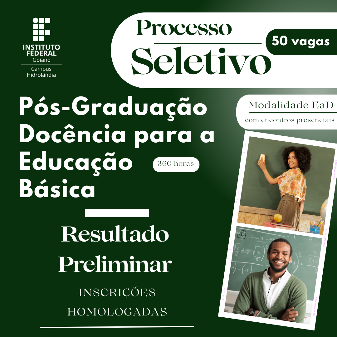 O IF Goiano Campus Hidrolândia torna público o Resultado Preliminar das Inscrições Homologadas referente ao Processo Seletivo para ingresso no Curso de Pós-Graduação...