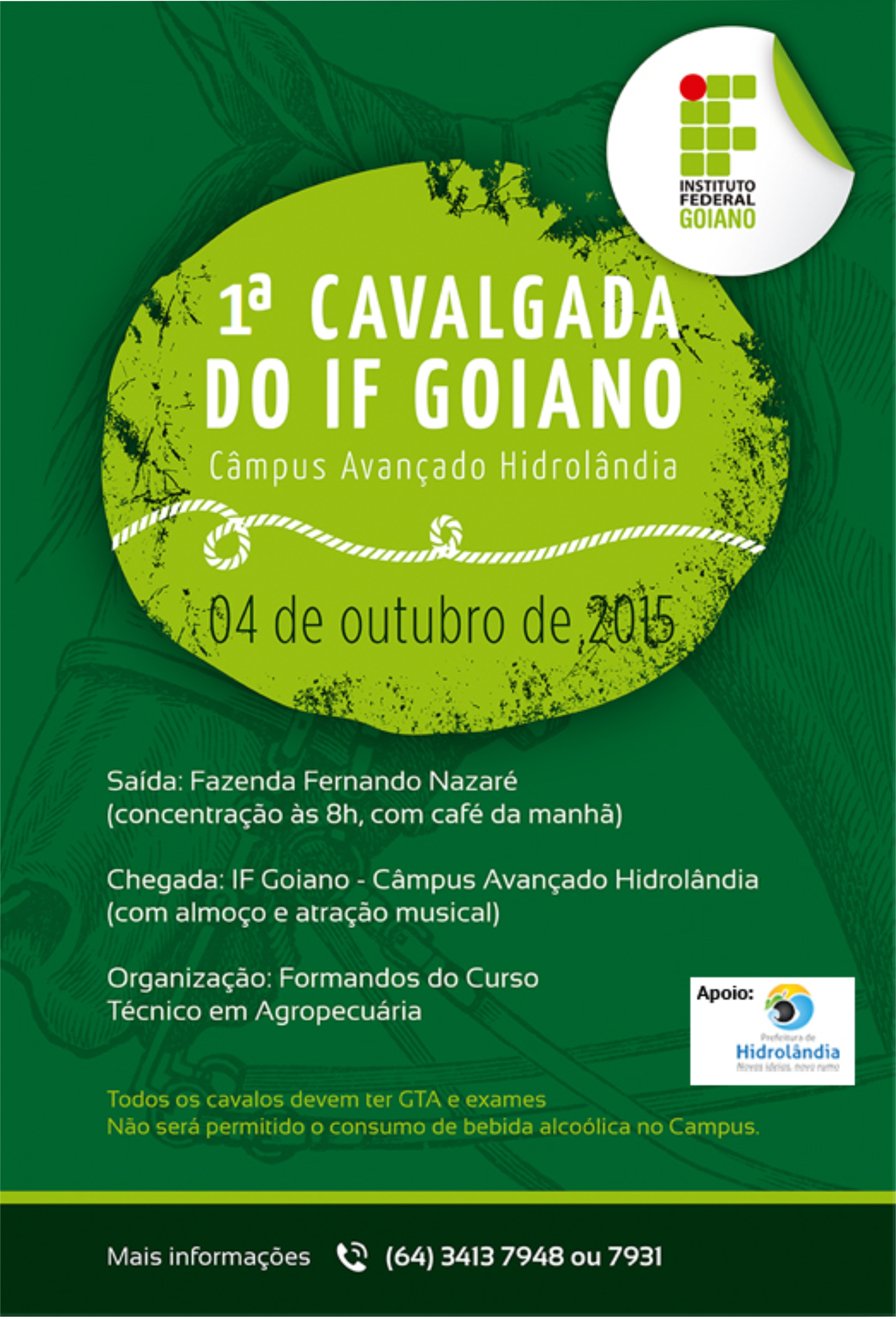 O Campus Avançado Hidrolândia convida para a 1ª Cavalgada do IF Goiano - Campus Avançado Hidrolândia.O evento ocorrerá no dia 04 de outubro de 2015 (Domingo) com saída da Fazenda...