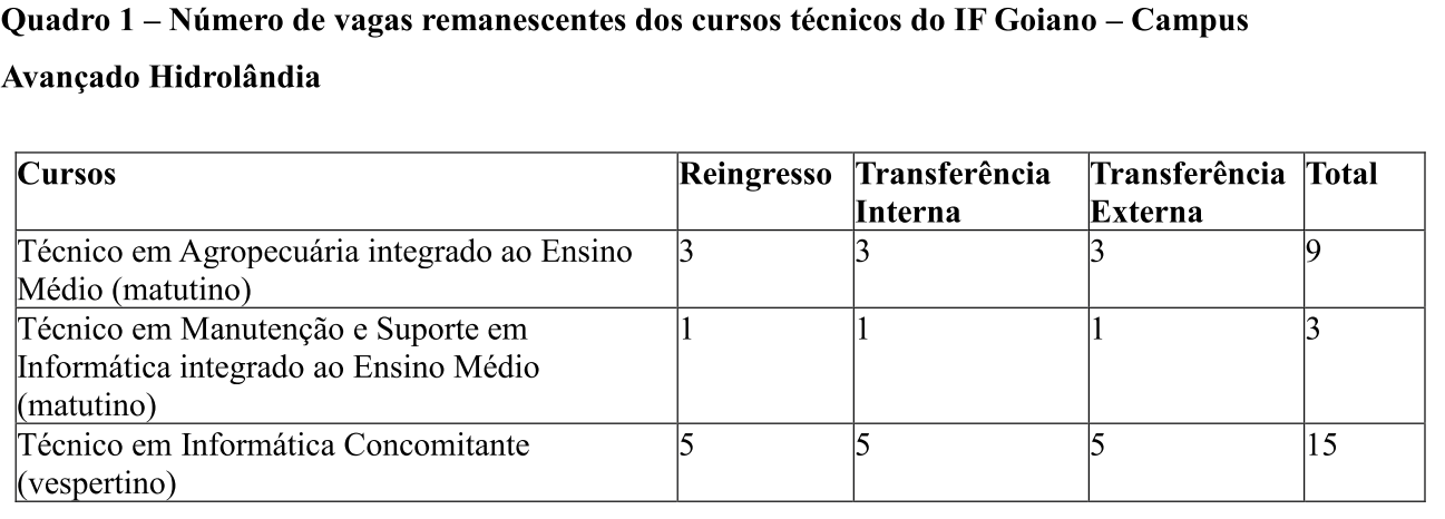 PROCESSO SELETIVO PARA TRANSFERÊNCIAS INTERNA E EXTERNA E REINGRESSO PARA OS CURSOS TÉCNICOS em Agropecuária Integrado ao Ensino Médio (matutino), Técnico em Manutenção e Suporte em Informática integrado ao Ensino Médio (matutino), Técnico em Informática Concomitante (vespertino). Verifique o quantitativo de vagas e inscreva-se até dia 09/03/18