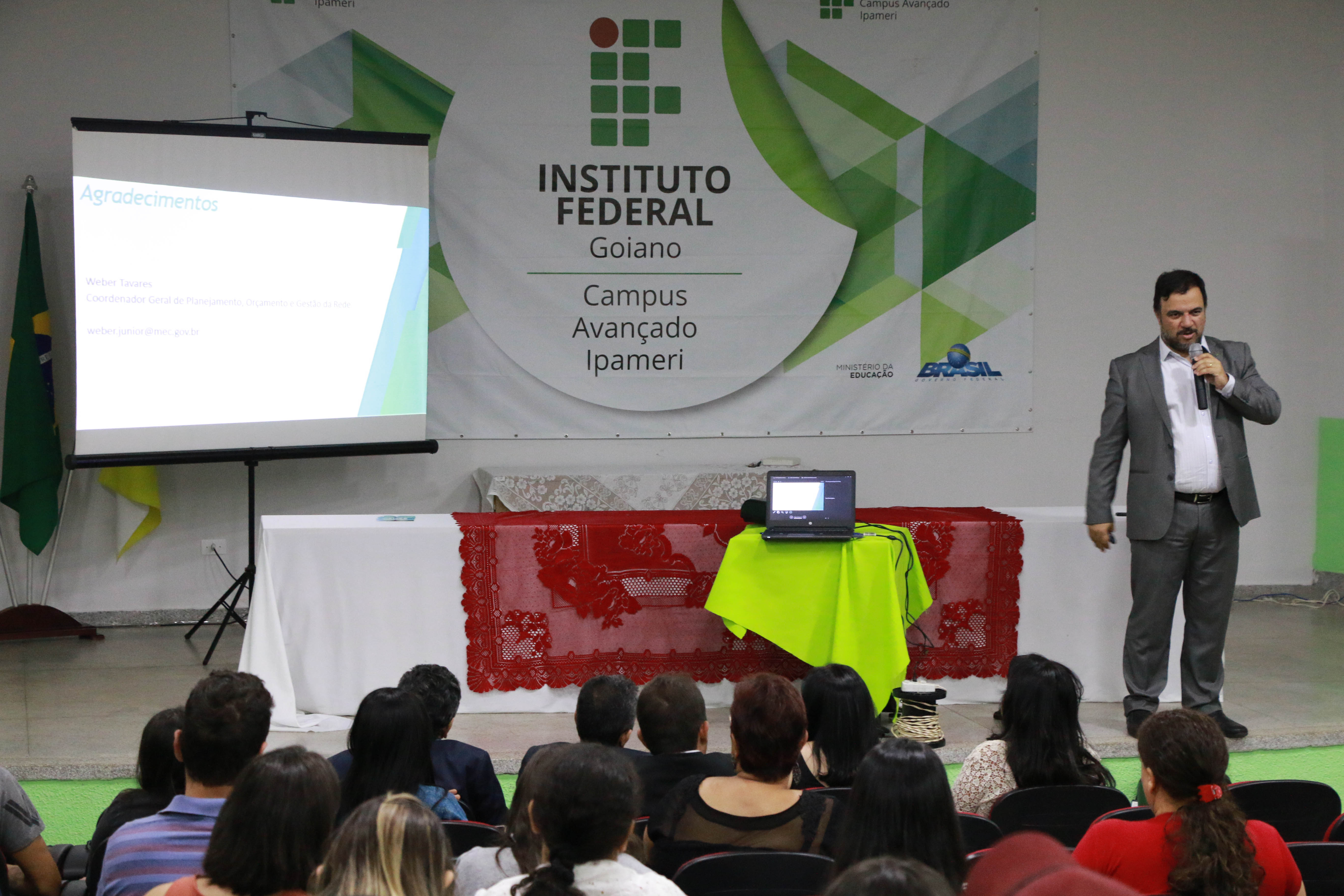 A palestra foi proferida no Auditório do Campus pelo Prof. Weber Tavares da Silva Junior, Administrador, Mestre em Agronegócios, professor do Instituto Federal de Goiás e atual Coordenador Geral de Planejamento, Orçamento e Gestão da Rede Federal - MEC.