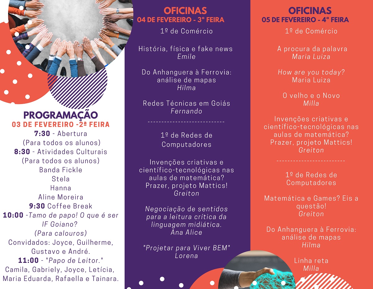 Está ocorrendo no período de 3 a 7 de fevereiro a Semana de Ambientação e Integração (SAI), no Campus Avançado Ipameri. O evento consiste em uma das ações do Produto Educacional (PE) desenvolvido pela mestranda do Programa de mestrado em Educação Profissional e Tecnológica (ProfEPT)- IFTO e servidora do Campus Avançado de Ipameri, Lorena Lopes da Costa.