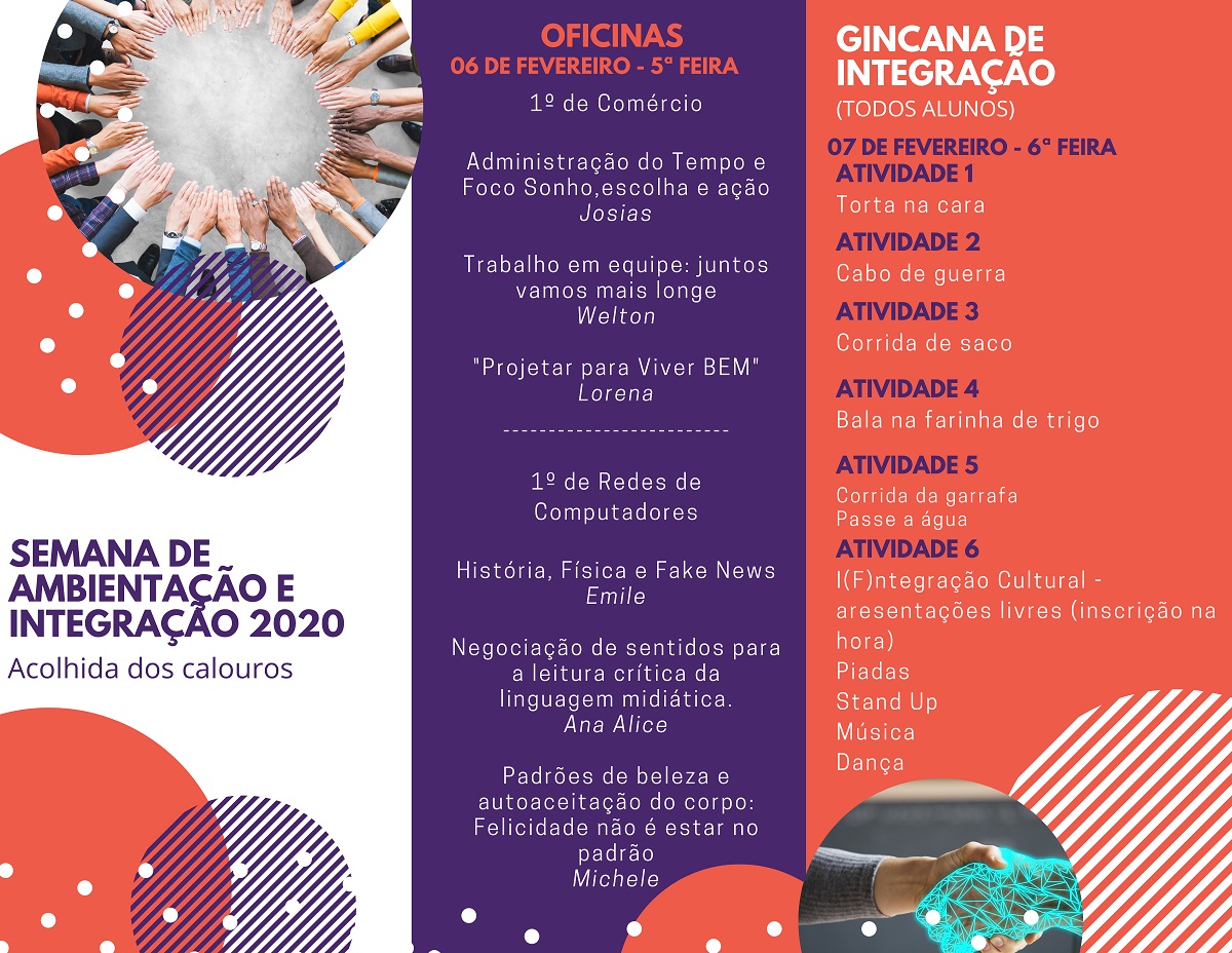 Ao longo da semana, os alunos calouros estão participando de oficinas que contemplam ciência, tecnologia e humanidades, aliando a teoria à prática e oportunizando ao educando vivências criativas e transformadoras. As atividades de acolhimento prosseguirão durante a semana com oficinas. O encerramento ocorrerá na sexta-feira, dia 7, com a realização de uma Gincana de Integração envolvendo todos os alunos dos cursos técnicos integrados ao Ensino Médio.