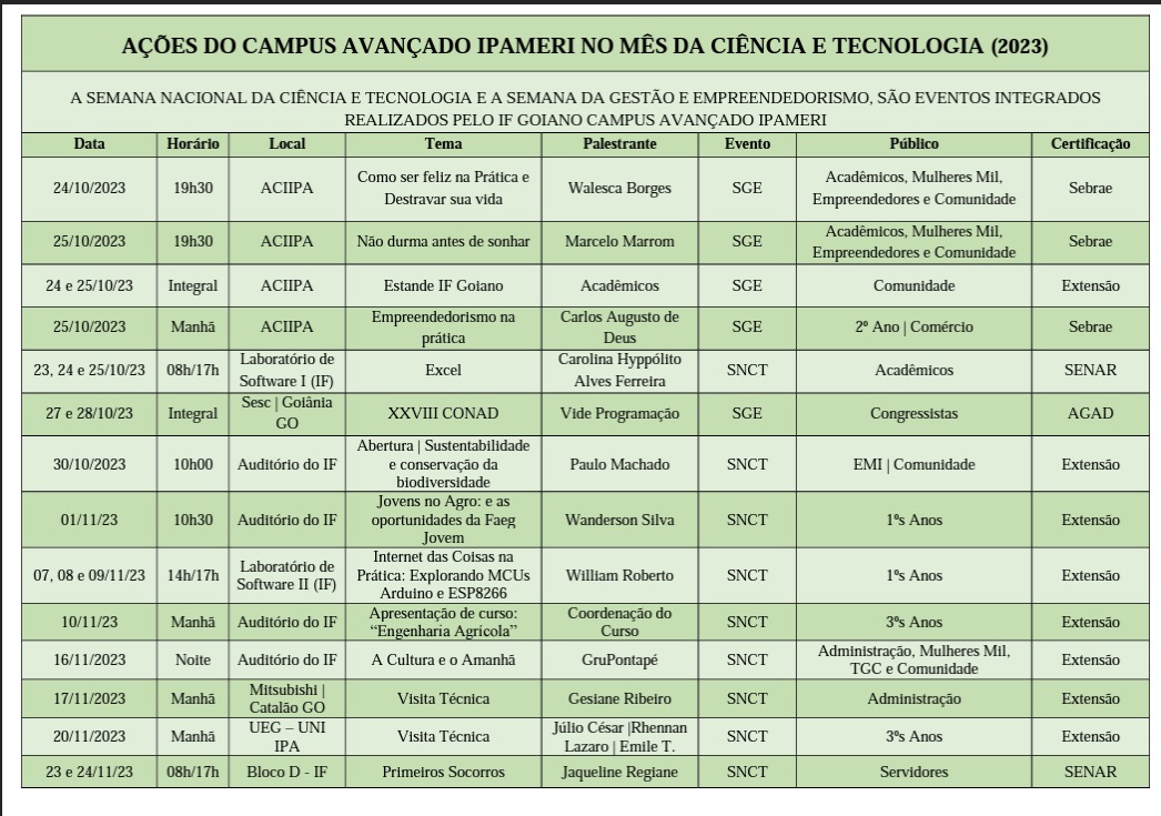 As palestras foram realizadas na Associação Comercial e Industrial de Ipameri (ACIIPA) pelo SEBRAE GO, entidade parceira do IF Goiano, por ocasião da Feira do Empreendedor 2023. Na noite de 24 de outubro, os estudantes dos cursos superiores, Bacharelado em Administração e Curso Superior de Tecnologia em Gestão Comercial, assistiram à palestra "Como ser feliz na prática e destravar", com Waleska Borges.